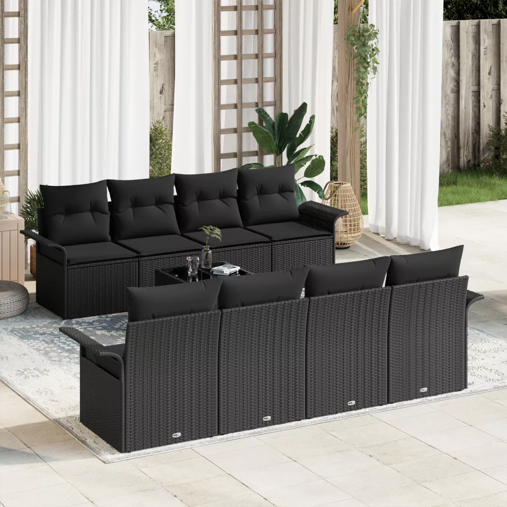 9 részes Kert Kanapé Szett Párnákkal Fekete Poli Rattan