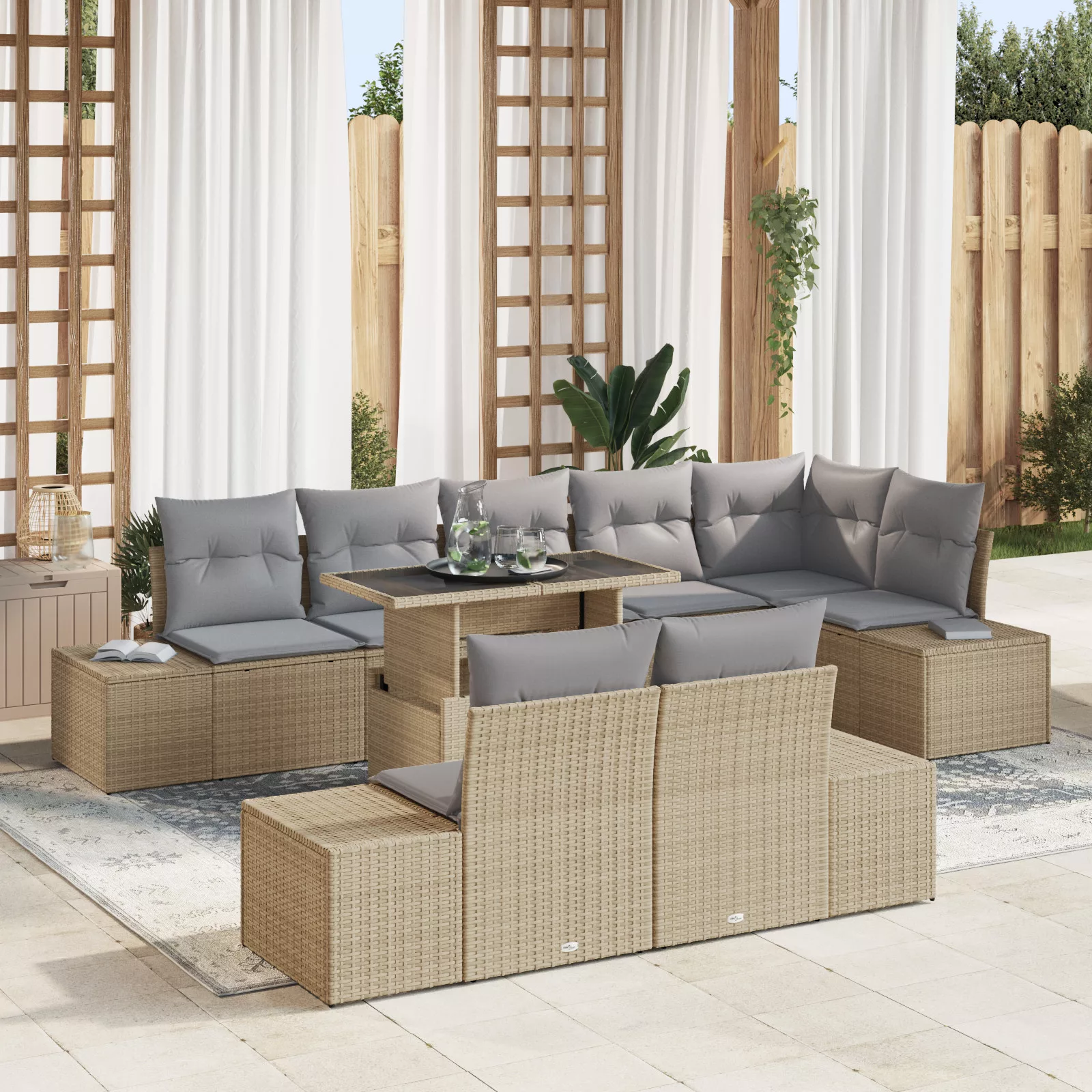Ez a 9 darabos kerti kanapé készlet stílusos és praktikus helyet biztosít kültéri és beltéri területeken, ötvözve a kényelmet a jó funkcionalitással. Moduláris kialakítása miatt a részeket az igényeid szerint rendezheted, így ideális különböző összejövetelekhez vagy pihenéshez, legyen szó napos erkélyről vagy kényelmes teraszról. Moduláris Kanapék: Az igényeid szerint tudod beállítani. Ez a rugalmasság lehetővé teszi, hogy különböző ülőhelyet alakíts ki az alkalomhoz. Kényelmes Párnák: Minden elem puha párnákkal van felszerelve, amik kényelmesek és levehető huzattal rendelkeznek a könnyű tisztítás érdekében. Élvezd a kényelmet pihenés vagy szórakoztatás közben. Stílusos Megjelenés: A szett modern megjelenésű texturált felülettel, ami jól passzol kortárs otthonokhoz vagy élénk kültéri helyszínekhez. Okos Tárolási Funkció: Minden ülés tároló rekesszel rendelkezik, hogy elrejtsd a párnákat vagy más alapfelszereléseket, így rendezetten tarthatod a területet. Időjárásálló Kivitel: Magas minőségű rattanból és poliészterből készült, ez a kanapé szett bírja az időjárást, így jól mutat beltéren és kültéren is.