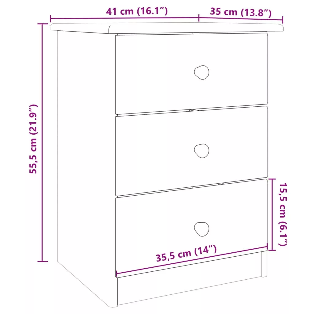 Ez a fából készült, stílusos dizájnnal ellátott éjjeliszekrény könnyen illeszkedik hálószobájába vagy nappalijába, és időtlen bájt kölcsönöz a belső térnek. Tömör fenyőfa: A tömör fenyőfa egy gyönyörű természetes anyag. A fenyőfa egyenes erezetű, a csomók pedig jellegzetes, rusztikus megjelenést biztosítanak az anyagnak. A tömör fenyőfából készült éjjeliszekrény strapabíró és masszív.Bőséges tárolóhely: Az éjjeliszekrény 3 kényelmes fiókkal rendelkezik, így elérhető közelségben tarthatja a legfontosabb dolgokat.Könnyen karbantartható: Az éjjeliszekrény könnyen tisztítható nedves ruhával, és kevesebb karbantartást igényel.Fa gombok: Az éjjeliszekrényhez fa gombok is tartoznak, amelyek megkönnyítik az éjjeliszekrény kinyitását és zárását, miközben tovább növelik a szépségét.Kezeletlen felület: Mivel az asztallap tömör fenyőfából készült felületkezelés nélkül, meghagyhatja a természetes színét, de tetszés szerint festheti vagy lakkozhatja is. Figyelem:A felborulás elkerülése érdekében ezt a terméket a mellékelt fali rögzítőeszközzel kell használni.