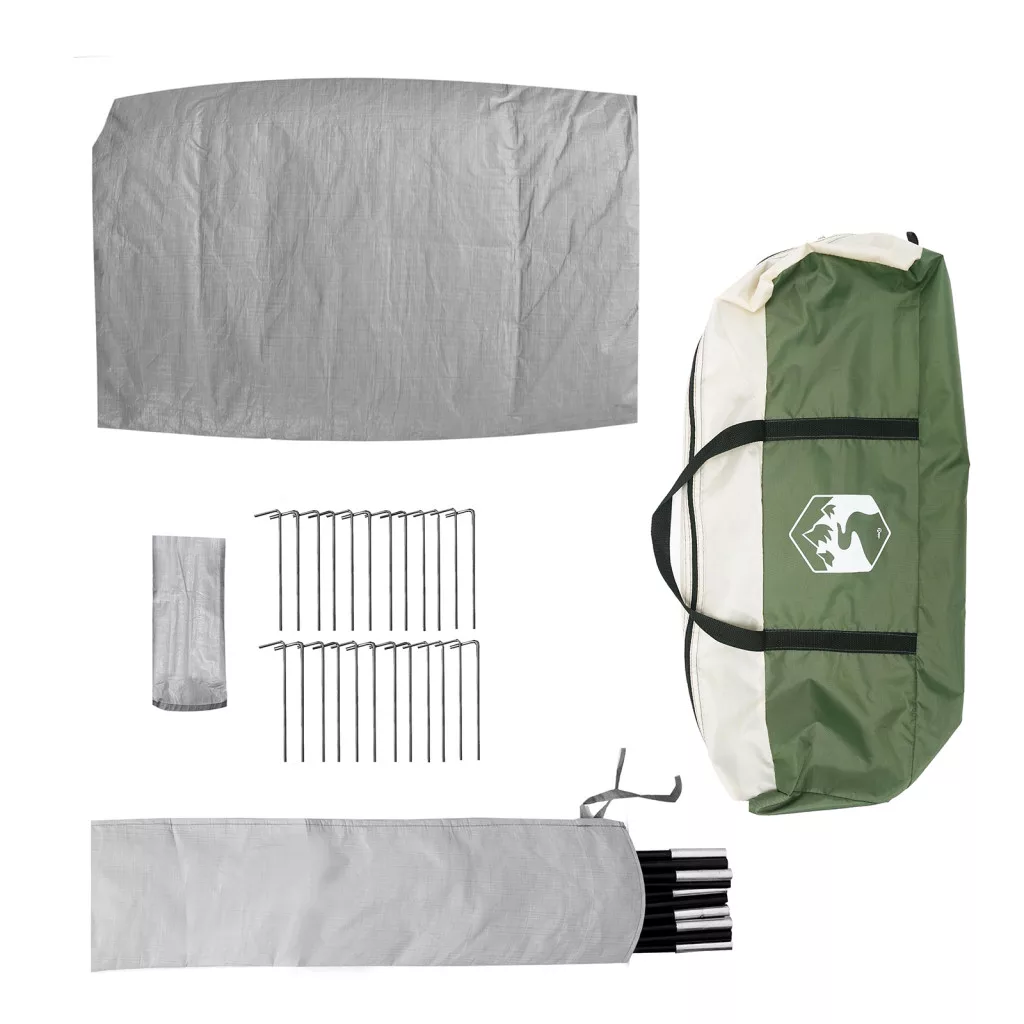 Az összecsukható alagútsátor kötelező kellék minden kempingkedvelő számára, aki megbízható és egyszerű felszerelést keres a kalandjaihoz. Modern dizájnja az egyszerűségről és a funkciókról szól, letisztult vonalakkal, felesleges sallangok nélkül. Akár vidéken állítod fel, akár egy forgalmas kempingben, ez a sátor tökéletesen illeszkedik, kényelmes helyet biztosítva egy éjszakára vagy hosszabb időre. Átlátszatlan, sima felépítése nemcsak intimebb körülményeket biztosít, hanem stílust is visz a szabadba—remek választás a kültéri szerelmeseknek. Minőségi Anyagok: Erős poliészterből és poliészterhálóból készült, ez a sátor tartós felépítéssel rendelkezik, üvegszálas műanyag részekkel, ami növeli a tartósságát. A polietilén és polipropilén használata segít az elhasználódás ellen, így megbízható menedéket kínál rossz időben is. Praktikus Komponensek: Ez a sátor mindennel fel van szerelve, amire szükséged lehet, mint például egy praktikus tárolóhely és egy biztonságos zóna, ahol rendezetten tarthatod a dolgaidat. Minden részletet gondosan megterveztek, hogy egy szuper kempingezési élményed legyen, mindig készen állva a kikapcsolódásra. Okos Jellemzők: Az összecsukható dizájnja miatt ez a sátor könnyen csomagolható és utazásra kész, így bármikor indulhatsz spontán kirándulásokra. Hordozható, de strapabíró is, jól alkalmazkodik bármilyen körülményekhez. Kültéri Rugalmasság: Bár kifejezetten kempingezésre készült, ez a sátor mindenféle kültéri helyszínen remekül teljesít—csendes erdőkben vagy zsúfolt fesztiválokon. Sokoldalúsága ideális önálló kempingezőknek vagy kis csoportoknak, akik békés menedéket keresnek. Gondozás és Karbantartás: Tartsd a sátorodat a legjobb állapotban azzal, hogy használat után mindig megtisztítod és megfelelően tárolod. Kerüld a közvetlen napfényt, hogy a sátorod sok kalandra megmaradjon szép és működőképes! Figyelmeztetés Tartson távol minden láng- és hőforrást ettől a termékszövettől.