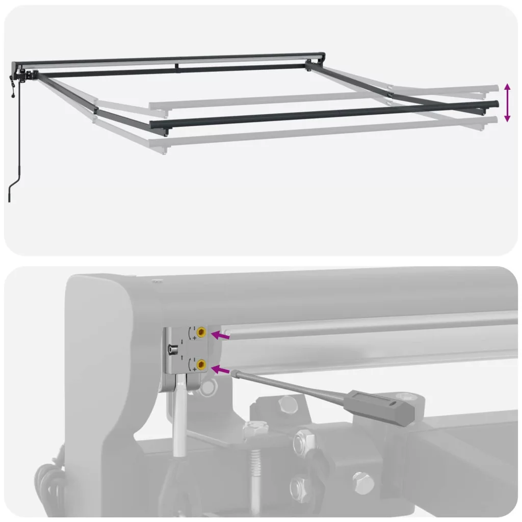 Ez a modern behúzható napellenző a legjobb választás bármelyik kerthez vagy teraszhoz, hiszen stílusos és praktikus napernyő megoldást kínál! A letisztult vonalak és minimalista dizájn bármely kültéri teret feldob, ha éppen egy nyári bulit szervezel, vagy csak hűvös árnyékra vágysz! A behúzható funkció lehetővé teszi, hogy a nap függvényében állítsd a kint töltött időt! Kültéri használatra tervezték, jól passzol a kert és terasz környezetébe, miközben modern stílust ad hozzá. Strapabíró anyagok: Poliészter és fém kombinálva adja a napellenző tartosságát! A poliészter szövet tartós, míg a fémváz szilárd csatlakozást biztosít, így ez a napellenző tényleg bírja az időjárás viszontagságait. Behúzható mechanizmus: Élvezd az árnyékot a rugalmas behúzható funkcióval! Ez a praktikus dizájn könnyű nyitást és zárást biztosít, alkalmazkodva a napsütés helyzetéhez, így felhasználóbarát választás a kültéri kényelemhez. Időjárásálló : UV-, víz- és fakulásálló, így ez a napellenző bármilyen időjárási körülmények között megőrzi megjelenését és funkcióját. A felhasználók mindig biztonságban érezhetik magukat a napfény ellen! Összeszerelési részletek: Két emberre lesz szükséged a csavarhúzóval való telepítéshez. Az egyszerű beállítás érdekében gyerekjáték az összeszerelés, mert csak alapvető szerszámokra van szükség! Nyári vonzerő: Kifejezetten szezoni használatra lett tervezve, ez a napellenző fokozza a kültéri terek használhatóságát, biztosítva a szükséges árnyékot a forró nyári napokon, barátságos légkört teremtve. Veszély! Kinyitáskor a rugó erősen kipattan. NE távolítsa el a kötelet addig, amíg az összes összeszerelési lépést be nem fejezte, az összes csavart nem rögzítette és az elem nincs a falhoz rögzítve! Figyelem! Legyen óvatos a karok kilazításakor, mert azok feszültség alatt állnak! Az összecsukható kar hirtelen kiengedése sérülést okozhat. Figyelmeztetés: A termék használata előtt el kell olvasni a használati útmutatót. Figyelem: A fagyos körülmények között történő használat kárt tehet a termékben. Külső felhasználás épületeknél és egyéb építkezéseknél. Ne engedje, hogy a gyerekek a redőny vezérlőeszközével játszanak. Tartsa a távirányítót távol a gyermekektől.