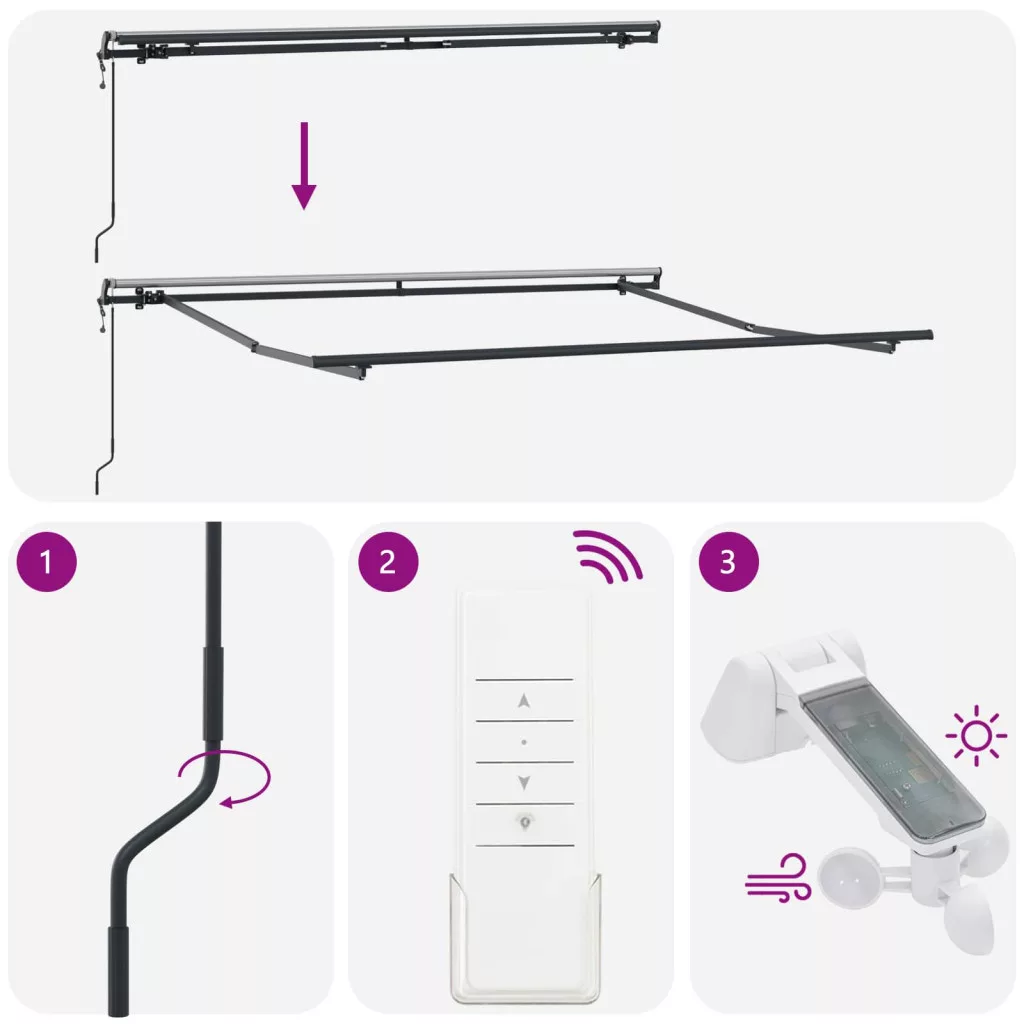 Ez a modern behúzható napellenző egy stílusos és praktikus megoldás a kültéri árnyékolásra, ideális kertekhez és teraszokhoz. Szép, letisztult dizájnja miatt jól illeszkedik a mai trendekhez, így szuper kiegészítése a kortárs kültéri tereknek. Fesztiválok alatt vagy baráti összejövetelekhez tökéletes védelmet nyújt a napsütés és az eső ellen, míg kényelmes helyet biztosít a lazításhoz. Anyagösszetétel: Strapabíró és könnyű alumíniumból készült, ez a napellenző stabilitást és megbízhatóságot nyújt. UV-álló és vízálló, így ideális kültéri használatra. Az alumínium váz biztosítja, hogy a napellenző jól bírja az időjárást, még a rossz napokon is. Altalános alkotóelemek: A csomagban minden fontos elem benne van: napellenző anyag, erős alumínium keret és távirányító a könnyű működtetéshez. Ezek mind hozzájárulnak a használat egyszerűségéhez és a zökkenőmentes működéshez. Könnyen behúzható: A napellenző behúzható, így gyorsan tudod igazítani az árnyékot a nap mozgásához. A manuális beállítás mellett a távirányító lehetősége nagyon kényelmes és ideális mindenki számára. Szezonális használat: Tökéletes a nyáron, mivel árnyékot ad a hűvös területekhez, miközben védi az UV-sugaraktól. Nagy előnyt jelent a napfényes napokon bármely kert vagy terasz számára. Karbantartási utasítások: Két ember és csavarhúzó segít az összeszerelésnél. Rendszeresen ellenőrizd a napellenzőt a törmelékek miatt, és tisztítsd enyhe szappannal. Ez meghosszabbítja az élettartamát és megőrzi a szép megjelenését. Veszély! Kinyitáskor a rugó erősen kipattan. NE távolítsa el a kötelet addig, amíg az összes összeszerelési lépést be nem fejezte, az összes csavart nem rögzítette és az elem nincs a falhoz rögzítve! Figyelem! Legyen óvatos a karok kilazításakor, mert azok feszültség alatt állnak! Az összecsukható kar hirtelen kiengedése sérülést okozhat. Figyelmeztetés: A termék használata előtt el kell olvasni a használati útmutatót. Figyelem: A fagyos körülmények között történő használat kárt tehet a termékben. Külső felhasználás épületeknél és egyéb építkezéseknél. Ne engedje, hogy a gyerekek a redőny vezérlőeszközével játszanak. Tartsa a távirányítót távol a gyermekektől.