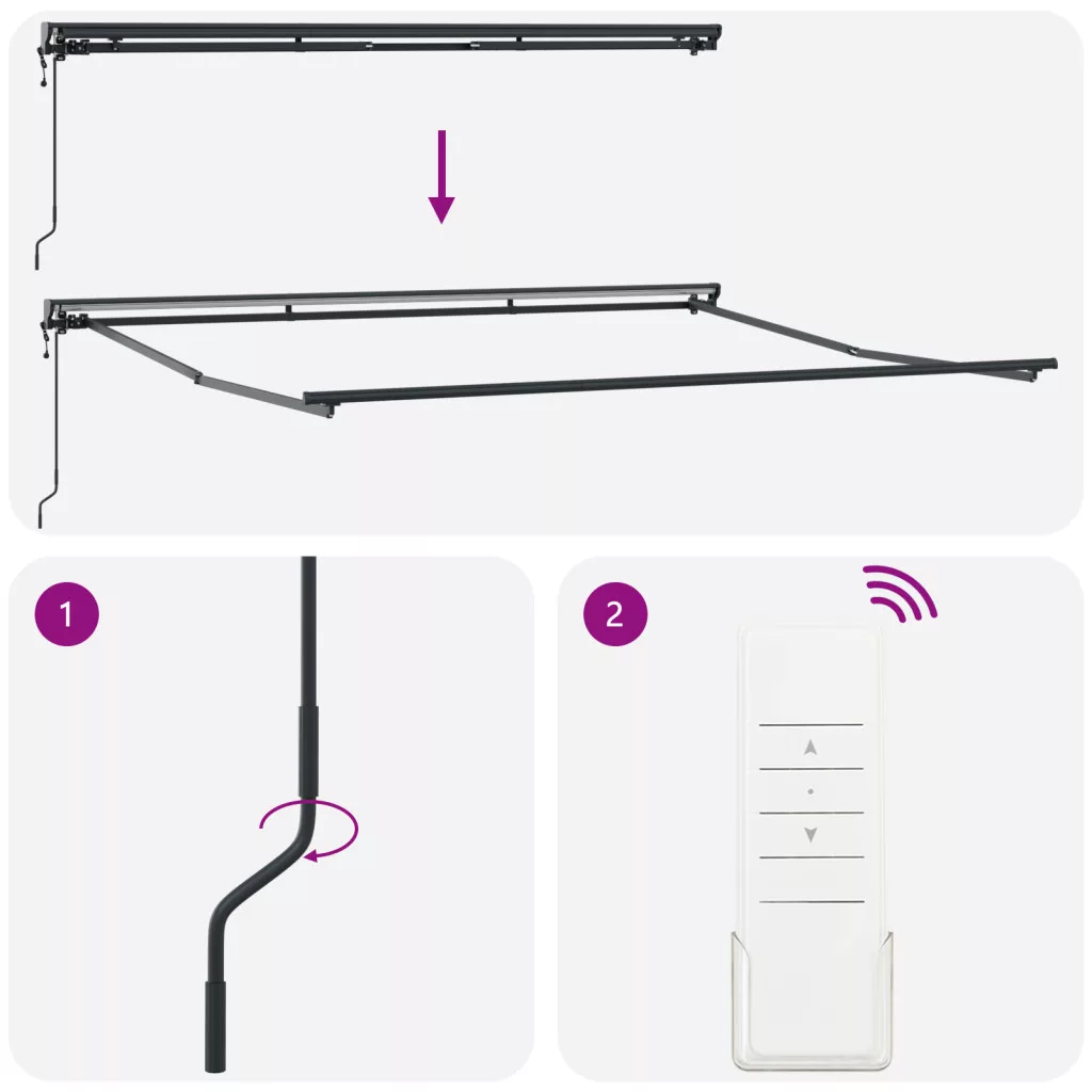 Ez a modern kültéri napellenző fantasztikus kiegészítője minden terasznak vagy kertnek. Stílusos ívei és friss kinézete nemcsak illik a kültéri tereidhez, hanem feldobja a nyári összejövetelek hangulatát is. Sokoldalú árnyékmegoldás, ideális családi vacsorákhoz vagy nyugodt időtöltéshez, rengeteg árnyékot és stílust kínál. UV-álló Design: Tökéletes a napos napokra, ez a napellenző olyan anyagokból készült, amik bírják a napot, így te és a vendégeid a hűs árnyékban lazíthattok anélkül, hogy aggódnotok kellene a kopás miatt. Modern, Sleek Megjelenés: Kortárs stílusa tiszta vonalakat és friss hangulatot kínál, így tökéletesen illik a mai kültéri trendekhez. Tényleg feldobja a kültéri életteredet. Állítható Karfák: Állítsd be a saját kényelmedért az állítható karfákat, amikkel mozgathatod a legjobb árnyék érdekében. Könnyű és kényelmes a kint ülni, még ha hosszabb ideig lazítasz is. Behúzható Funkció: A behúzható funkció lehetővé teszi, hogy könnyedén visszahúzd, amikor éppen nincs szükséged rá, ami szuper az időjárás változása esetén. Ezen kívül segít hosszabbítani az élettartamát, mert nem tartózkodik folyamatosan a napon. Összeszerelve a Nyári Szórakozáshoz: Össze kell raknod, de ne aggodj; egyszerű. Miután felállítottad, a kültéri tered egy árnyékos menedékké válik, ami tökéletes a pihenéshez vagy szórakozáshoz. Veszély! Kinyitáskor a rugó erősen kipattan. NE távolítsa el a kötelet addig, amíg az összes összeszerelési lépést be nem fejezte, az összes csavart nem rögzítette és az elem nincs a falhoz rögzítve! Figyelem! Legyen óvatos a karok kilazításakor, mert azok feszültség alatt állnak! Az összecsukható kar hirtelen kiengedése sérülést okozhat. Figyelmeztetés: A termék használata előtt el kell olvasni a használati útmutatót. Figyelem: A fagyos körülmények között történő használat kárt tehet a termékben. Külső felhasználás épületeknél és egyéb építkezéseknél. Ne engedje, hogy a gyerekek a redőny vezérlőeszközével játszanak. Tartsa a távirányítót távol a gyermekektől.