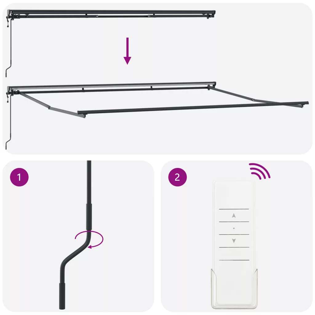 Ez a modern kültéri napellenző fantasztikus kiegészítője minden terasznak vagy kertnek. Stílusos ívei és friss kinézete nemcsak illik a kültéri tereidhez, hanem feldobja a nyári összejövetelek hangulatát is. Sokoldalú árnyékmegoldás, ideális családi vacsorákhoz vagy nyugodt időtöltéshez, rengeteg árnyékot és stílust kínál. UV-álló Design: Tökéletes a napos napokra, ez a napellenző olyan anyagokból készült, amik bírják a napot, így te és a vendégeid a hűs árnyékban lazíthattok anélkül, hogy aggódnotok kellene a kopás miatt. Modern, Sleek Megjelenés: Kortárs stílusa tiszta vonalakat és friss hangulatot kínál, így tökéletesen illik a mai kültéri trendekhez. Tényleg feldobja a kültéri életteredet. Állítható Karfák: Állítsd be a saját kényelmedért az állítható karfákat, amikkel mozgathatod a legjobb árnyék érdekében. Könnyű és kényelmes a kint ülni, még ha hosszabb ideig lazítasz is. Behúzható Funkció: A behúzható funkció lehetővé teszi, hogy könnyedén visszahúzd, amikor éppen nincs szükséged rá, ami szuper az időjárás változása esetén. Ezen kívül segít hosszabbítani az élettartamát, mert nem tartózkodik folyamatosan a napon. Összeszerelve a Nyári Szórakozáshoz: Össze kell raknod, de ne aggodj; egyszerű. Miután felállítottad, a kültéri tered egy árnyékos menedékké válik, ami tökéletes a pihenéshez vagy szórakozáshoz. Veszély! Kinyitáskor a rugó erősen kipattan. NE távolítsa el a kötelet addig, amíg az összes összeszerelési lépést be nem fejezte, az összes csavart nem rögzítette és az elem nincs a falhoz rögzítve! Figyelem! Legyen óvatos a karok kilazításakor, mert azok feszültség alatt állnak! Az összecsukható kar hirtelen kiengedése sérülést okozhat. Figyelmeztetés: A termék használata előtt el kell olvasni a használati útmutatót. Figyelem: A fagyos körülmények között történő használat kárt tehet a termékben. Külső felhasználás épületeknél és egyéb építkezéseknél. Ne engedje, hogy a gyerekek a redőny vezérlőeszközével játszanak. Tartsa a távirányítót távol a gyermekektől.