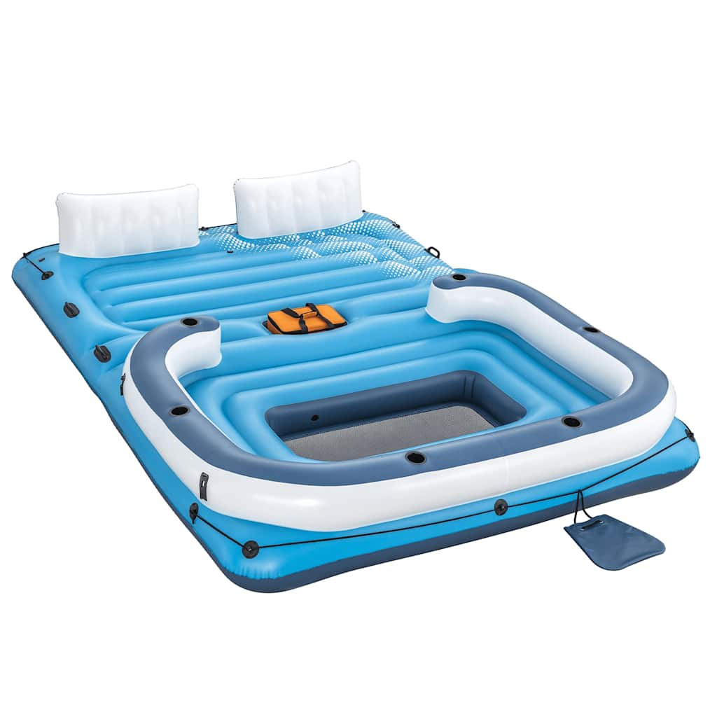Hívja meg barátait, hogy együtt pihenjenek ezen a stílusos Bestway 43105 matracon! Gyorsan felfújható és leereszthető. Ez a lebegő társalgó extra széles párna háttámlákat és 6 beépített pohártartót tartalmaz. Egy hűtőtáska szintén alaptartozék az italok hűvösen és elérhető távolságban való tartására. Mindkét végén kapaszkodók és erős fogantyúk találhatók. A hozzátartozó leszerelhető napellenző árnyékot tart megóvva Önt a nap káros UV-sugaraitól. Kiváló minőségű vinilből készült, így ez az úszó társalgó nagyon tartós és elég erős ahhoz, hogy felszínen tartsa Önt. 6 személy kényelmesen elfér, maximális teherbírása 540 kg. Élvezze a tökéletes kikapcsolódást és kényelmet ezzel az úszó társalgóval!