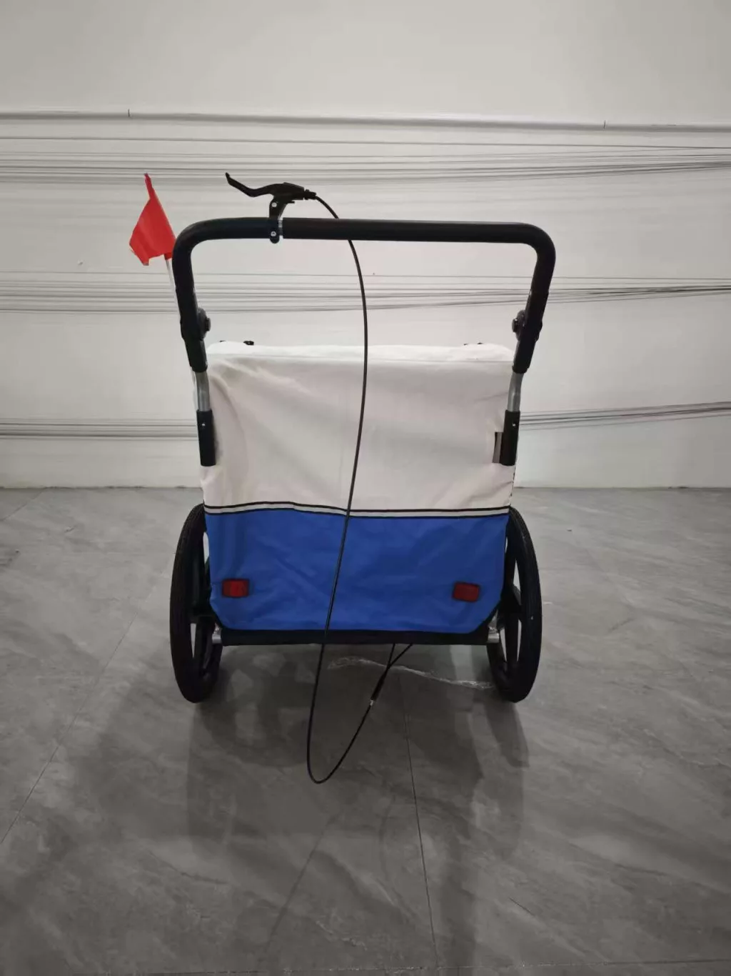 The child trailer features a strong steel frame and durable Oxford fabric, making it waterproof, long-lasting, and easy to maintain. The protective canopy and mesh provide optimal protection from sunlight and rain, while the transparent side windows offer an excellent panoramic view. Safety is ensured with a 5-point harness, and reflective wheel accents make the trailer highly visible. The side-mounted handbrake allows you to stop the trailer anywhere, and thanks to the swivel hitch, the trailer remains stable even if the bicycle tips over.