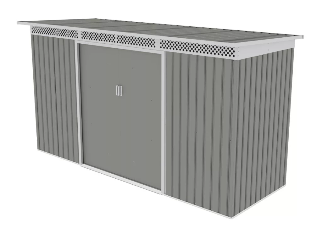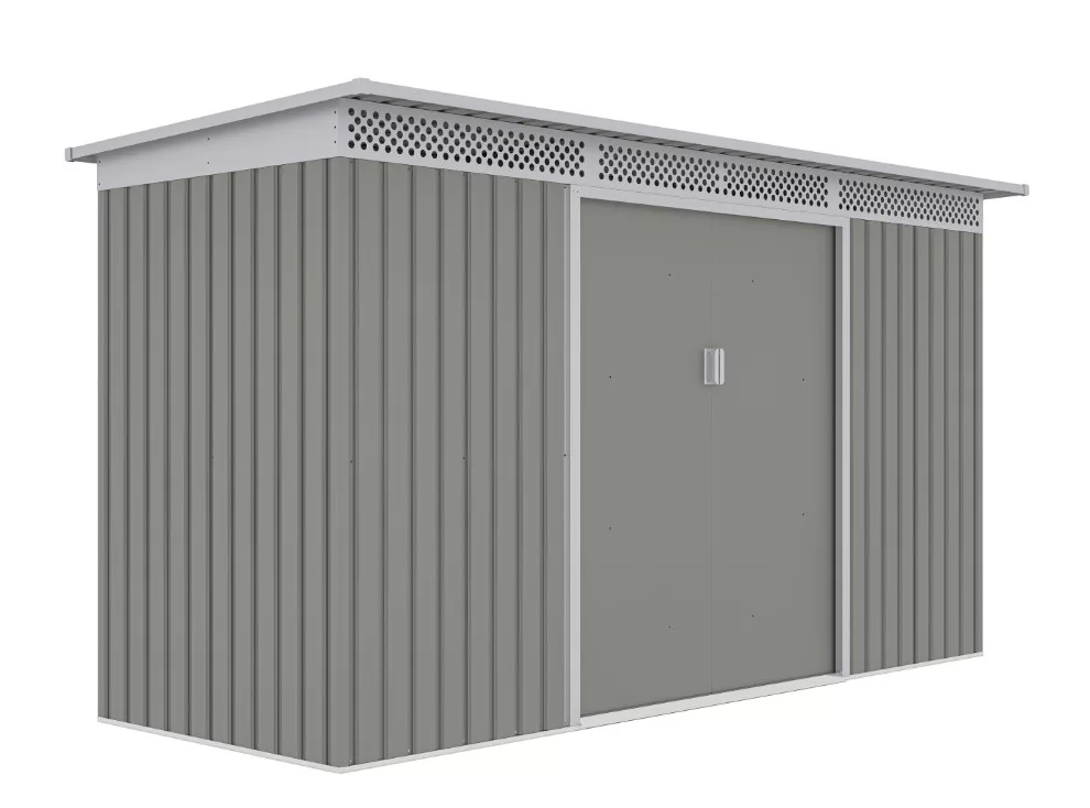 A tároló félnyeregtetője 2° dőlésszöggel rendelkezik. Az oldalsó falakon a tető túlnyúlik, így jobban védi a tároló falait a kedvezőtlen időjárástól. A kerti tároló tetője maximum 60 kg/m2 hóterhelésnél biztonságos.Javaslat: A tároló vásárlása előtt, a hóterhelés miatt ellenőrizze a hótérképen azt a helyet, ahová a tárolót szeretne építeni.A tető alatt az egész elülső falon horganyzott fémlemezből készült szellőzőrács van. A rács két célt szolgál - beengedi a napfényt és javítja a légáramlást.