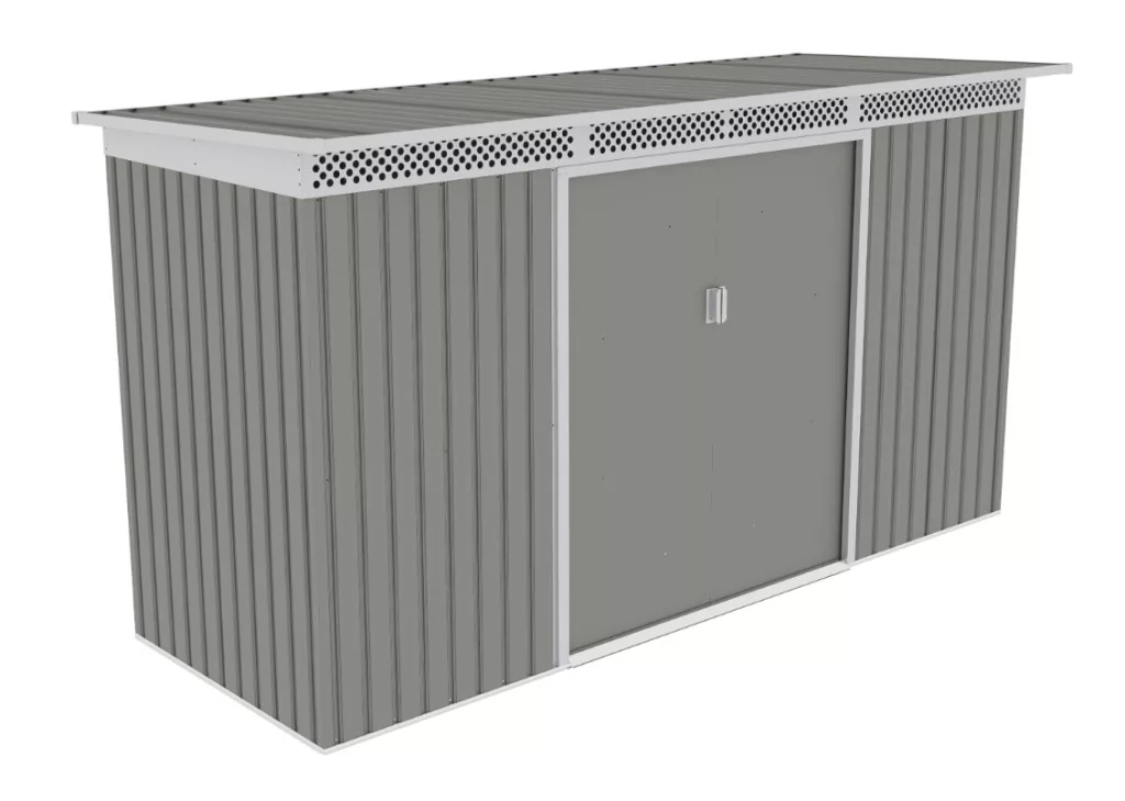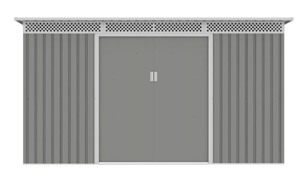 A kerti tároló kétszárnyas ajtóval van ellátva. A bejárat így igazán kényelmes akkor is, ha nagyobb tárgyat visz be vagy ki.A tolóajtó mindkét szárnya kilinccsel van ellátva az egyszerű kinyitásra. A kilincs el van készítve egy lakat felszerelésére.
