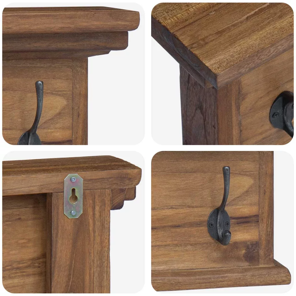 Ez a falra szerelhető kabátakasztó azoknak való, akik értékelik a stílust és a funkcionalitást. Prémium tömör tikfából készült, meleg és elegáns hatást kelt, így tökéletes kiegészítője a vintage stílusú nappaliknak és hálószobáknak. Téglalap alakja és gyönyörű fájgrainje klasszikus dizájnt sugall, ami minden dekorációhoz passzol. Tömör tikfa szerkezet: A kabátakasztó erős, tömör tikfából készült, ami nemcsak szép, hanem tartós is, biztosítva az időtlen megjelenést. Beépített polc: Plusz tárolóhelyet ad kalapoknak, kesztyűknek vagy kulcsoknak, így praktikus megoldás a bejáratok rendben tartására. Tartós dupla kampók: Minden kampó kézzel készült, erős tartást ad a kabátoknak és dzsekiknek, a dupla kialakítás praktikusabbá teszi a használatát. Falra szerelhető telepítés: Helyet spórol, elegáns megjelenést kölcsönöz, a stabil rögzítés pedig biztonságos használatot garantál. Ápolási utasítások: Használj gyengéd portalanítást az abrazív tisztítószerek helyett, hogy megőrizd a polc és a kampók szépségét évekig.