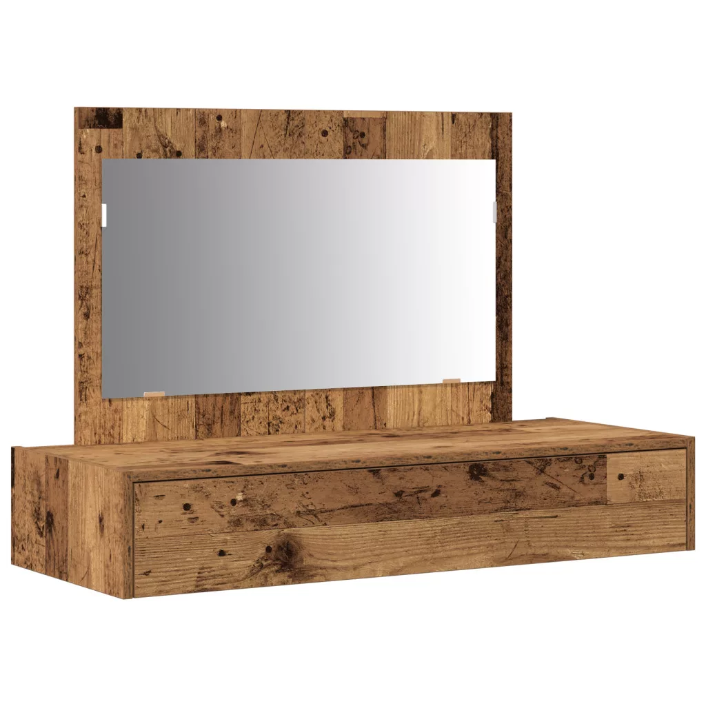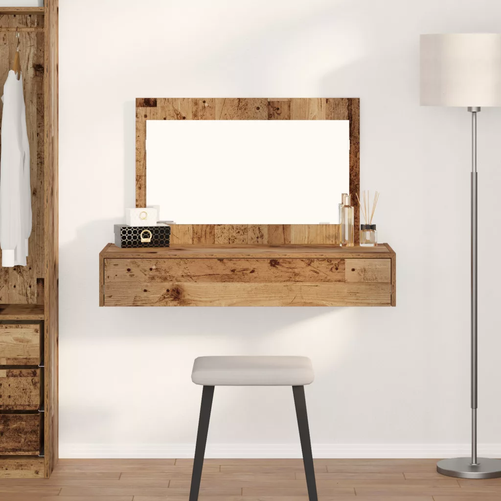 Ez a fali pipereasztal a rusztikus báj és a hasznos funkciók mixe. Ideális választás bármilyen hálószobához vagy ápolási területhez. Az egyedi régi fa felülete és masszív dizájnja nemcsak jól néz ki, de rengeteget kínál a mindennapi ápolószereknek. A falra szerelhető dizájn helyet spórol a padlón, miközben az öltözködési cuccaid könnyen elérhetőek. A nagy fiók segít a kozmetikumok és kiegészítők rendszerezésében, így minden rendben van. A síktükör szebbé teszi az ápolási rutint, visszatükrözve a természetes fényt, és kellemes hangulatot teremt a szobádban. Tömör újrahasznosított fából készült, ez a pipereasztal mind a stílusban, mind az erősségben hosszú távú használatot ígér. 100 cm hosszú, 40 cm széles és 70 cm magas, ami ideális egyensúlyt biztosít a méret és a funkcionálás között, különböző szobákhoz jól illik.