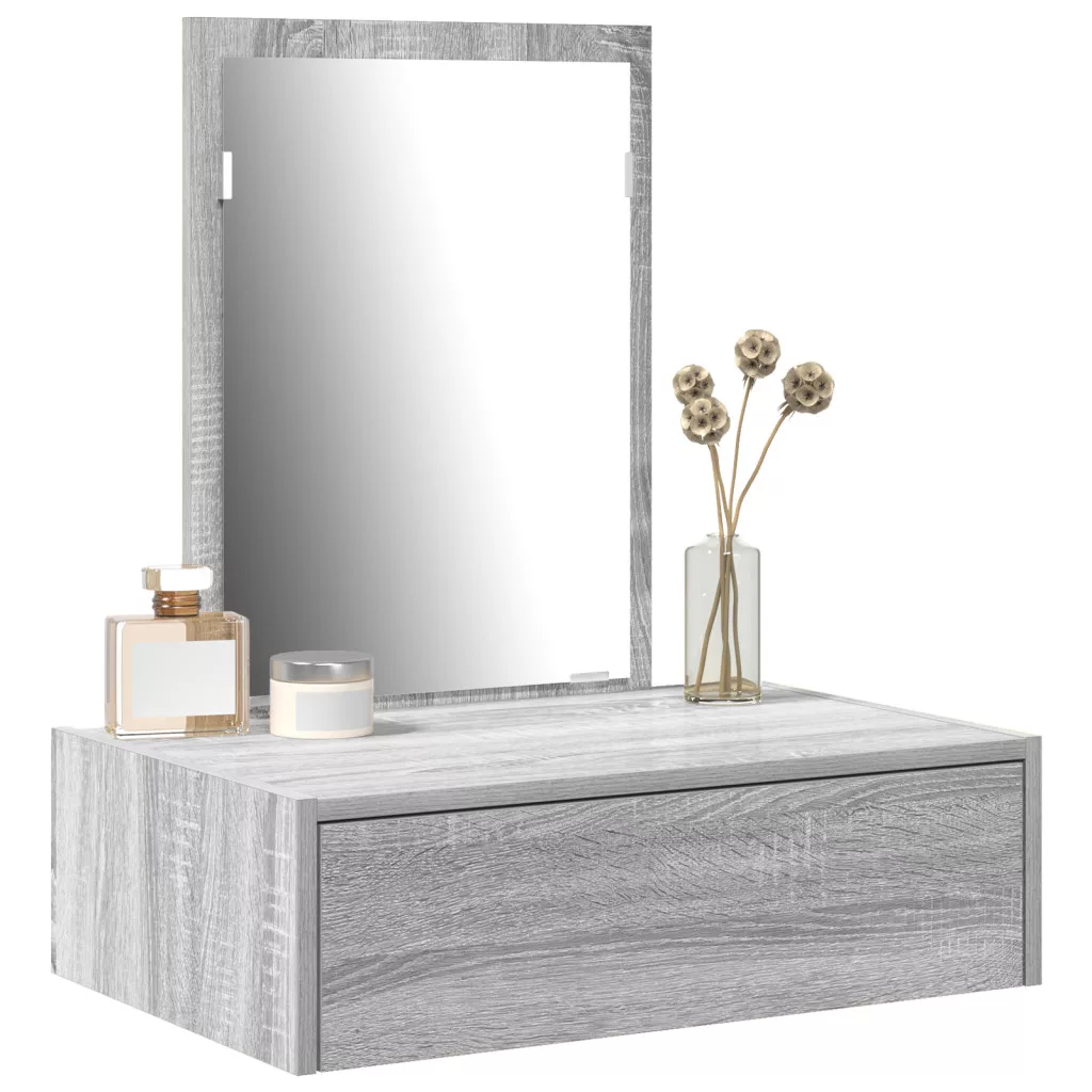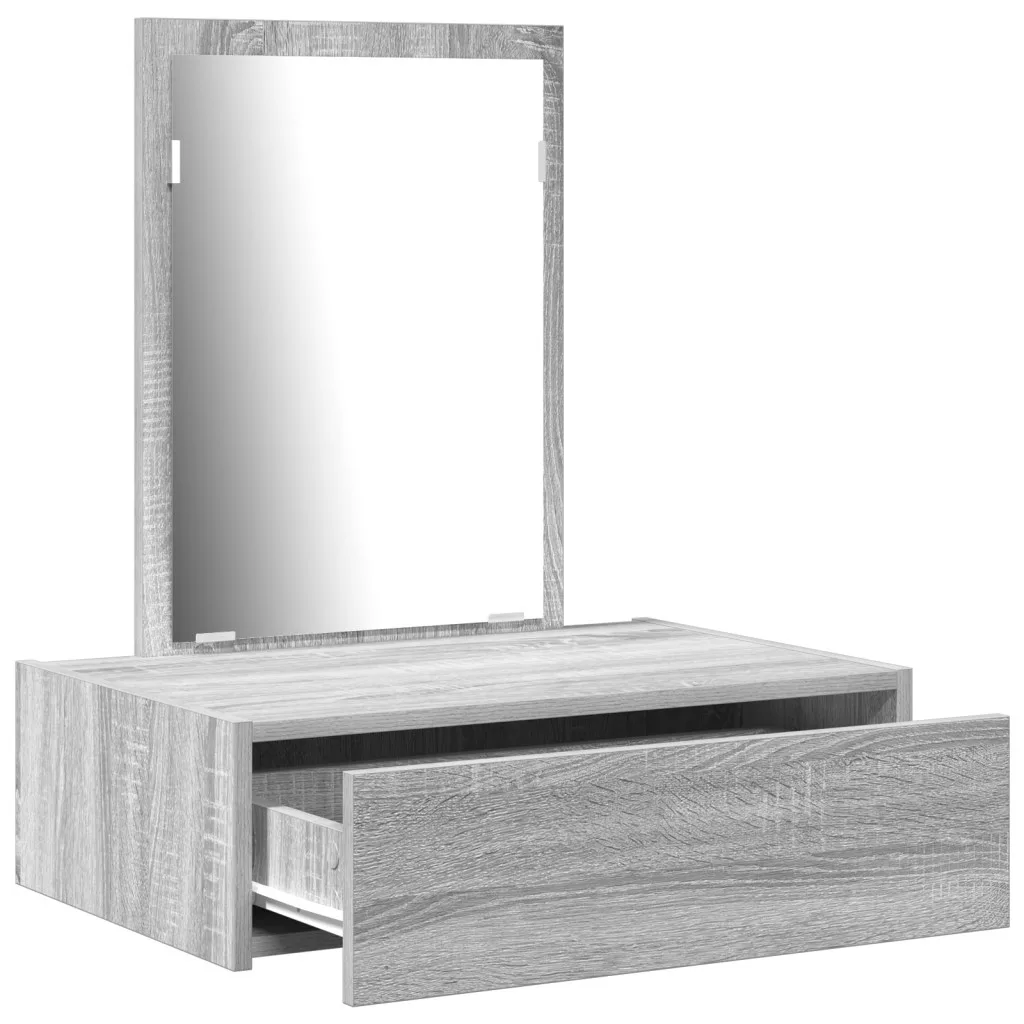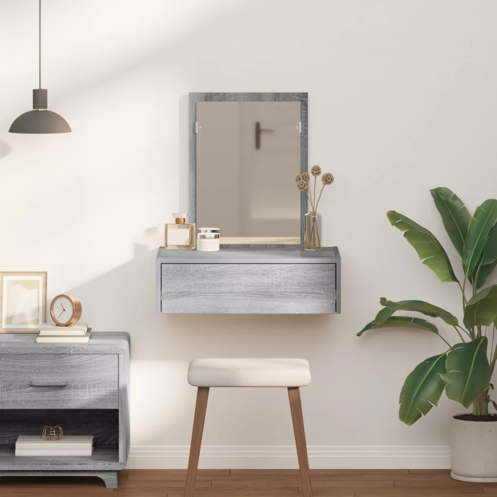 Ez a fali pipereasztal modern megjelenésével és praktikus funkcióival éppen jó bármely hálószobába vagy piperehelyiségbe. A sima szürke sonoma felület és a tiszta vonalak nemcsak szépek, hanem nagyon hasznosak a napi ápoláshoz. A fali kialakítás maximálisan kihasználja a helyet, rendezetten tartja a dolgokat, miközben könnyen elérheted pipere kellékeidet. A bőséges fiók biztosítja a rendezett tárolást, így a kozmetikumok és kiegészítők rendben és könnyen elérhetőek maradnak. A sima tükör emeli az ápolási rutinodat azzal, hogy visszaveri a természetes fényt, világos hangulatot teremtve a szobádban. Felső kategóriás mérnöki fából készült, így ez a pipereasztal tartós és idővel is megőrzi stílusát. A méretei 60 cm hosszú, 40 cm széles és 70 cm magas, ami ideális a különböző szobai beállításokhoz.