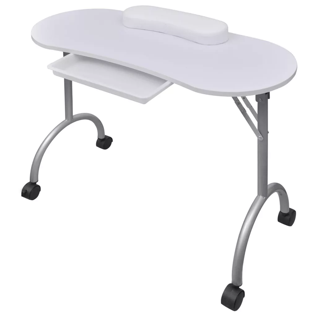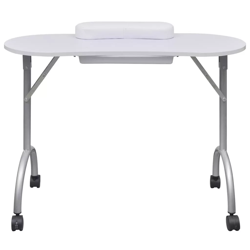 Ez az összecsukható manikűr asztal, vastag csuklópárnával tökéletes mind professzionális, mind személyes használatra. A vastag, műbőrrel kárpitozott csuklópárna kényelmes helyzetben tartja kezét a manikűr során. A nagy asztallap elegendő helyet kínál kezének és az összes manikűr kelléknek. A beépített fiókban viszont tárolhatja kis manikűr szerszámait, mint például a körömvágókat, körömlakkokat, körömreszelőket stb. A 2 zárható görgőt úgy tervezték, hogy biztosítsák az asztal mobilitását, de ugyanakkor egyszerűen mozdulatlanná is lehessen tenni. A tömör acéllábaknak köszönhetően manikűr asztalunk tartós. Helymegtakarítás céljából könnyedén összecsukható. A szállítmány tartalmaz egy fekete poliészter hordtáskát is, ezáltal az asztal könnyen hordozható.