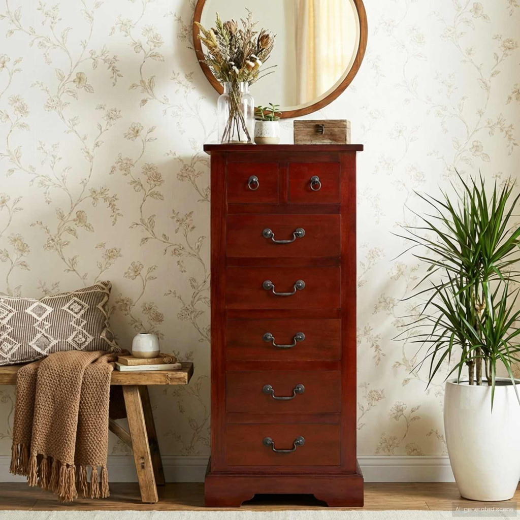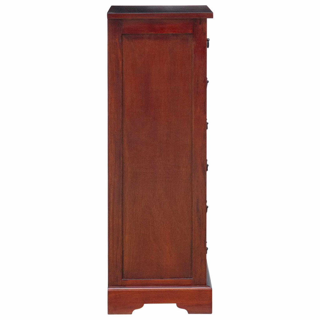 Ez az elegáns fiókos szekrény stílust és funkciót egyesít, így biztos, hogy feldobja otthonodat. Tömör mahagóni fából készült, strapabíró és modern megoldás minden szobához. Tömör mahagóni kivitel: Ez a szekrény prémium mahagóni fából készült, ami erőssé és széppé teszi. A gazdag szín és mintázat luxus érzetet ad, és éveken át megőrzi a stílusát. Bőséges fiók kialakítás: A több fiók rengeteg tárolóhelyet biztosít a ruháknak, ágyneműknek vagy kiegészítőknek. Praktikus a napi használathoz és mindig rendezett marad. Időtlen esztétika: Klasszikus vonalai és szép barna színe miatt ez a fiókos szekrény mindenféle dekorációhoz passzol. A letisztult dizájn és a gazdag színek szuper harmóniát biztosítanak bármely térben. Minimalizált karbantartás: Csak egy puha ruhára van szükség a por letörléséhez és a szekrény szép állapotának megőrzéséhez. Egyszerűen tisztán tartható. Kész a használatra: Mivel teljesen összeszerelt állapotban érkezik, például azonnal be tudod állítani otthonodba, és elkerülöd az összeszerelési gondokat.
