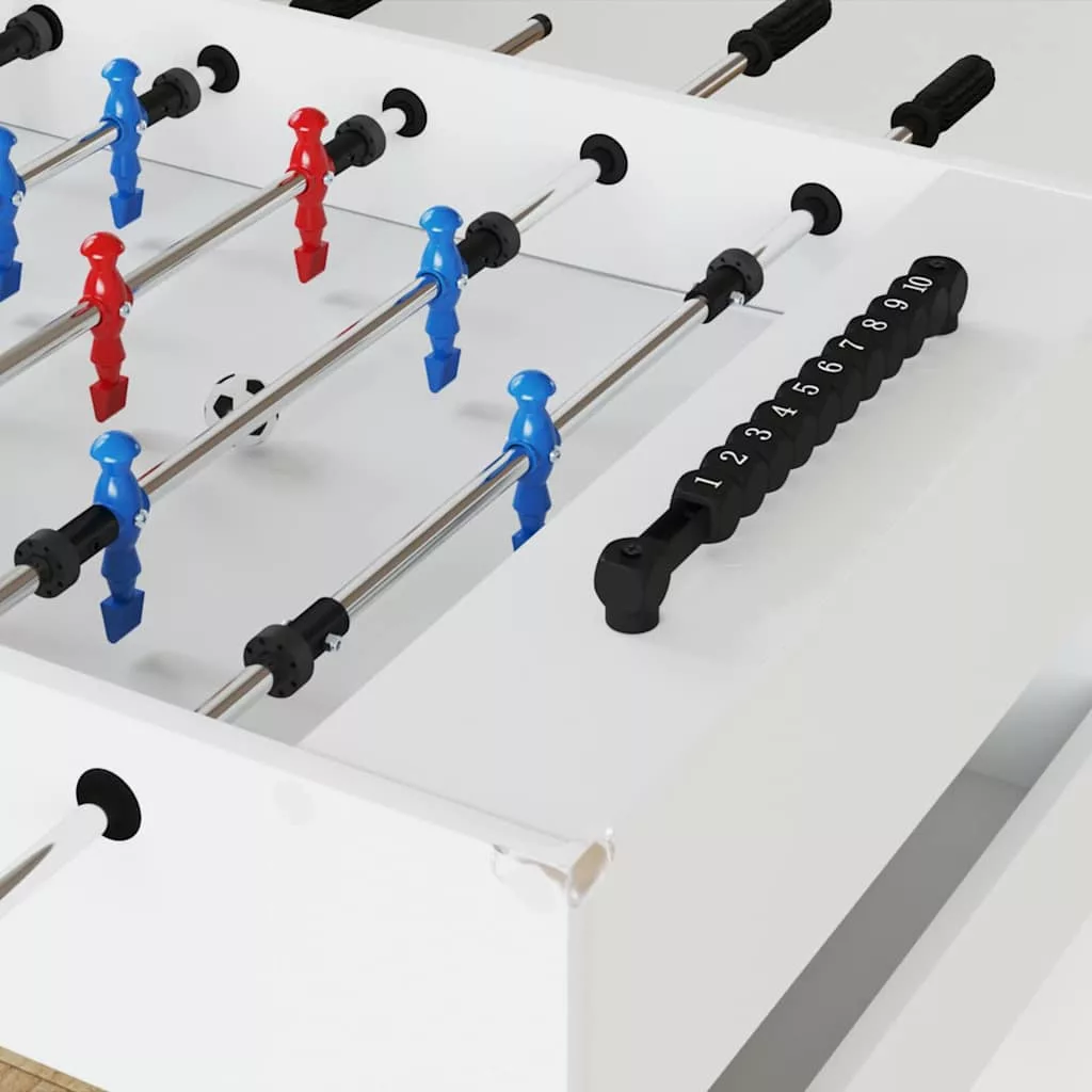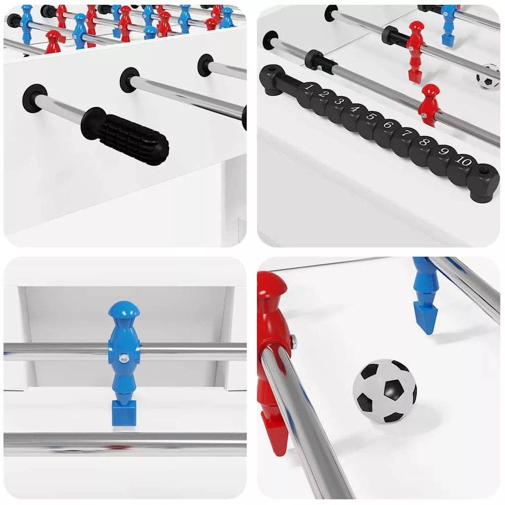 Ez a fa csocsóasztal a modern dizájnt és a praktikumot ötvözi. Szuper a beltéri szórakozásra, elegáns téglalap alakú dizájnja bármelyik szobába passzol, és még egy kis stílust is csempész a légkörbe. Letisztult anyaga és dizájnja ideálissá teszik baráti összejövetelekhez, akár versenyképes meccsekhez, akár vidám csoportos játékokhoz. Minimalista stílusú megoldásaival könnyen beilleszthető különböző terekbe. Kopásálló anyag A szerelt fa tartós, így bírja a folyamatos játékot, és megőrzi szép külsejét is. Erős alapot ad a játékhoz és fokozza az élményt. Teljes felszerelés Teljesen fel van szerelve 8 játékrúddal, 2 táblával és akceszszorokkal, mint például labdafogók. Minden eleme a játékélményt fokozza, kezdőknek és profiknak is egyaránt jó. Átgondolt funkciók Csúszásmentes fogantyúk garantálják, hogy biztosan tartsd az irányítást, még a legintenzívebb játék közben is. Ez a figyelmes tervezés csökkenti a csúszást és növeli a pontos játékot. Sokoldalú játék lehetőségek Az asztal egyéni és csoportos játékhoz is tökéletes, bármilyen rendezvényre. Legyen az játékkal töltött este vagy egyszerű családi meccs, ez a csocsóasztal mindmáig szórakozást nyújt. Egyszerű karbantartás Csak egy száraz rongy kell a tisztításhoz, kerüld a kemikáliákat. Így az asztal mindig szép és friss marad, készen áll a következő játékmenetre.
