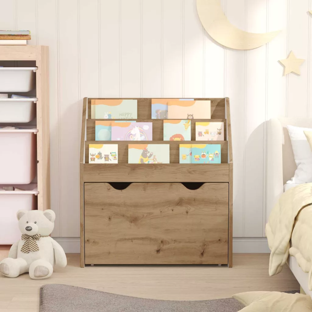 A modern gyerek könyvespolc csodás kis darab, amit a funkcionalitás és az egyszerűség jellemez, így tökéletes bármely gyerekszobához. Ez az önálló bútor letisztult vonalakkal és sima felülettel bír, ami illik mindenféle otthoni környezethez, mint a hálószobák, játszószobák vagy dolgozószobák. Masszív műanyag fa: Ez a könyvespolc masszív fából készült, ami tartós és stabil. Elegáns kinézete miatt évekig a gyerek szobájának alappillére lehet. Jó tároló kapacitás: Az innovatív tárolós megoldásoknak köszönhetően a könyvespolc rekeszeket és fiókokat tartalmaz a könyvek és kisebb játékok rendszerezésére. Az okos dizájn maximálisan kihasználja a tárolóhelyet, de nem foglal el sok helyet. Önálló dizájn: Önálló állásra készült, ez a könyvespolc rugalmasan elhelyezhető bármely szobában, falhoz támasztás nélkül. Sokoldalú dizájnja lehetővé teszi, hogy különböző méretű helyiségekhez illeszkedjen. Gyerekbarát jellemzők: Kifejezetten a fiataloknak készült, a könyvespolc könnyen elérhető polcokat kínál, amik segítik a függetlenséget. Gyönyörű ívei és stabil alapja csökkenti a balesetek kockázatát, biztonságos környezetet teremtve a kicsiknek. Könnyű összeszerelés: A könyvespolc összeállítása gyerekjáték, csak egy csavarhúzóra van szükség. Egy pár ember simán összerakja, így biztonságos és stabil beállítást érhetnek el, minimálisra csökkentve a felborulás esélyét. Az egész folyamat egyszerű, és egy olyan bútordarabot eredményez, ami jól mutat bármilyen stílusban.