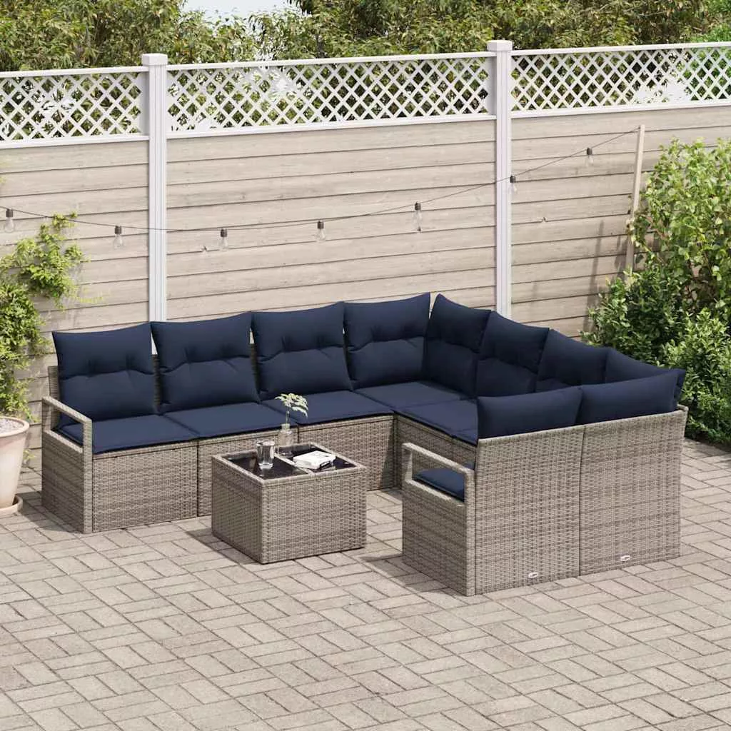 Kanapé Szett párnával 9 pcs Szürke és Tengerész Kék polirattan