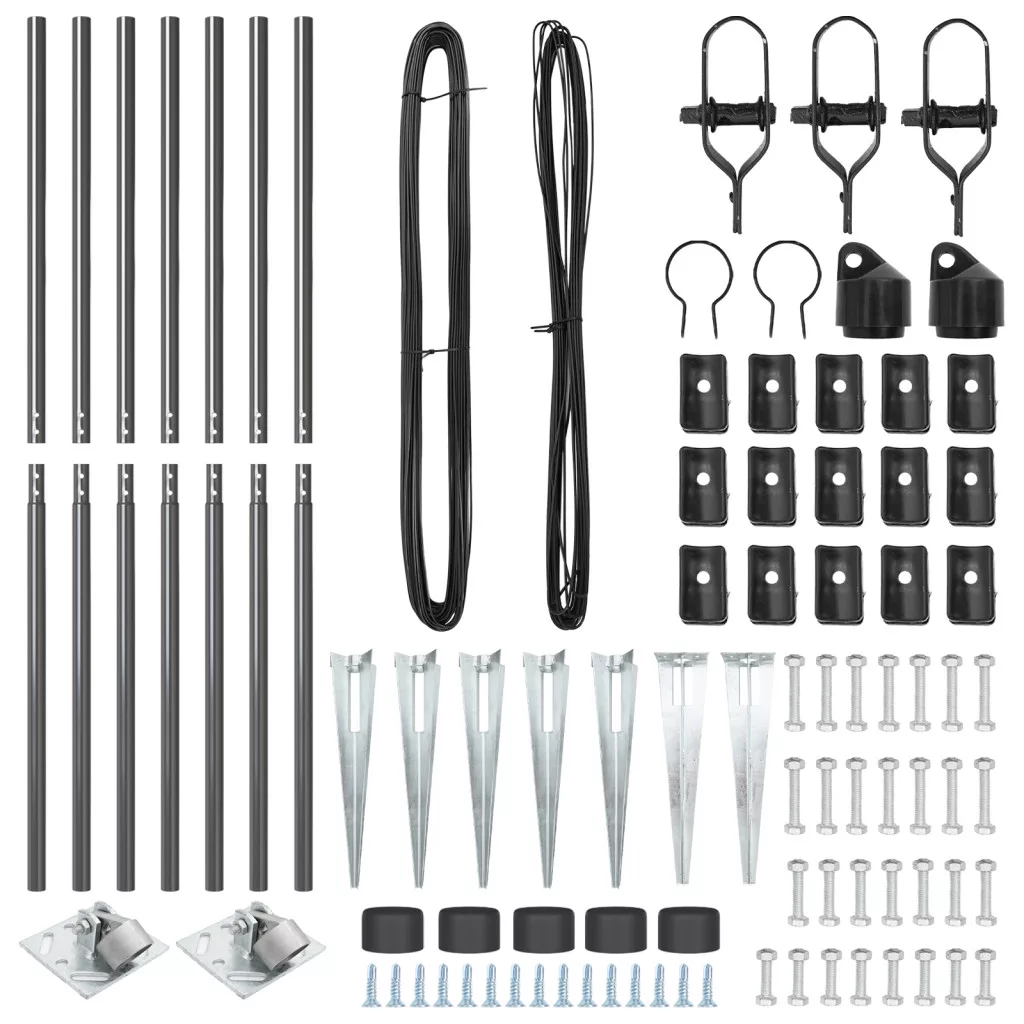 A csomag tartalmazza: 5 x Oszlop, 2 x Sarok oszlop, 5 x Cövek, 2 x Sarok cövek, 5 x Műanyag sapka, 15 x Műanyag feszítődrót támogató, 15 x Csavar a műanyag támogatóhoz, 2 x Sarok oszlop sapka, 2 x Sarok oszlop felszerelés, 3 x Feszítő, 1 x 25m kötöződrót, 1 x 33m feszítődrót