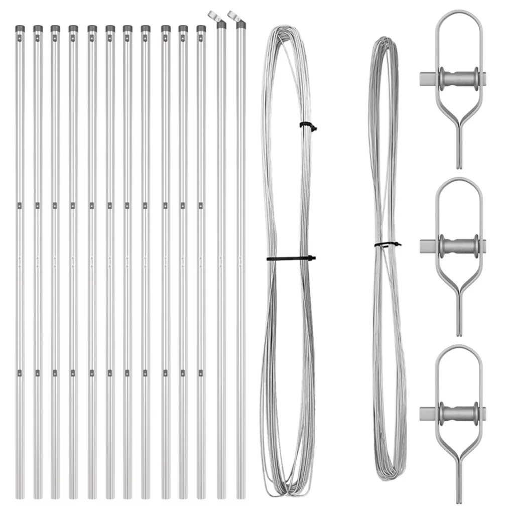 Szállítás tartalma: 11 x Oszlop, 2 x Sarokoszlop, 11 x Műanyag fedél, 33 x Műanyag feszítő drót támogató, 33 x Csavar a műanyag támogatóra, 2 x Sarokoszlop fedél, 2 x Sarokoszlop tartozék, 3 x Feszítő, 1 x 25m Kötődrót, 1 x 80m Feszítő drót