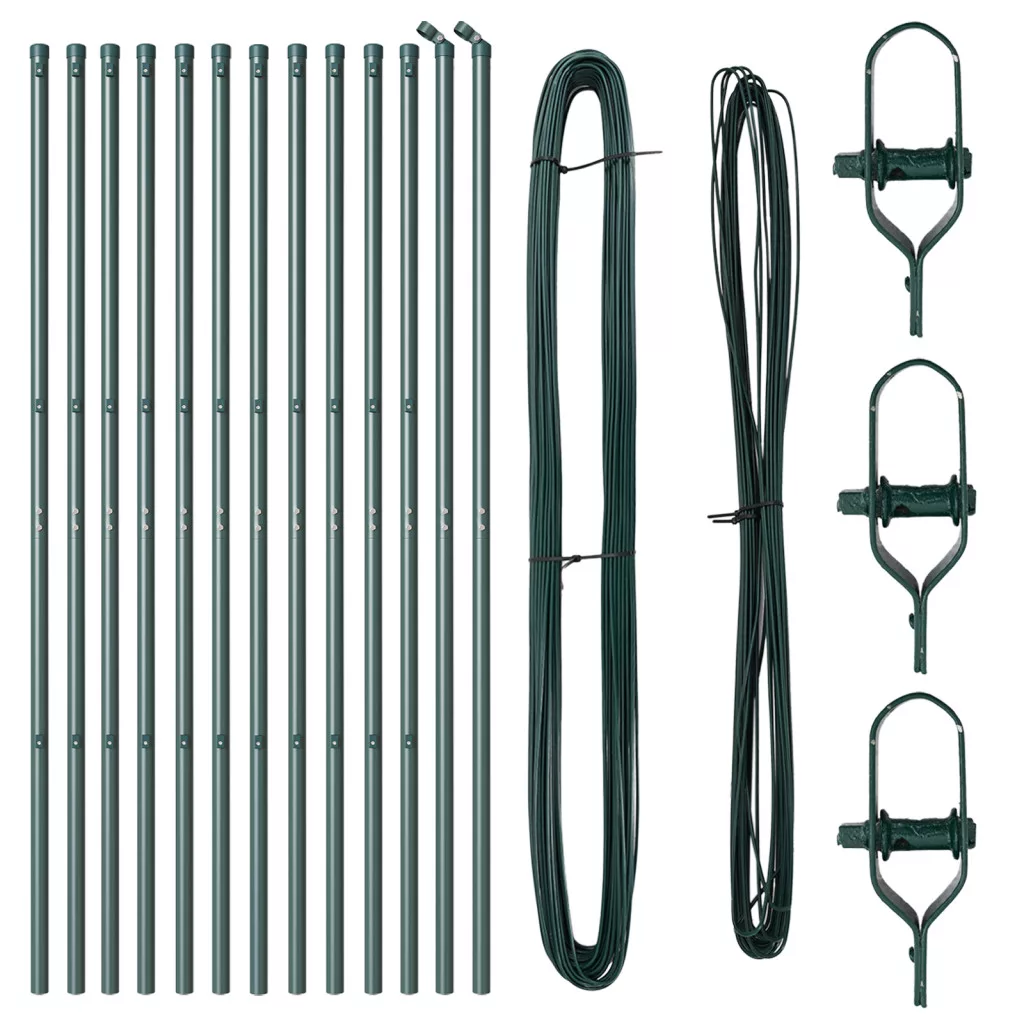 A szállítás tartalmazza: 11 x Oszlop, 2 x Sarokoszlop, 11 x Műanyag kupak, 33 x Műanyag feszítődrót tartó, 2 x Sarokoszlop kupak, 2 x Sarokoszlop hardver, 3 x Feszítő, 1 x 25 m Kötöző drót, 1 x 80 m Feszítő drót