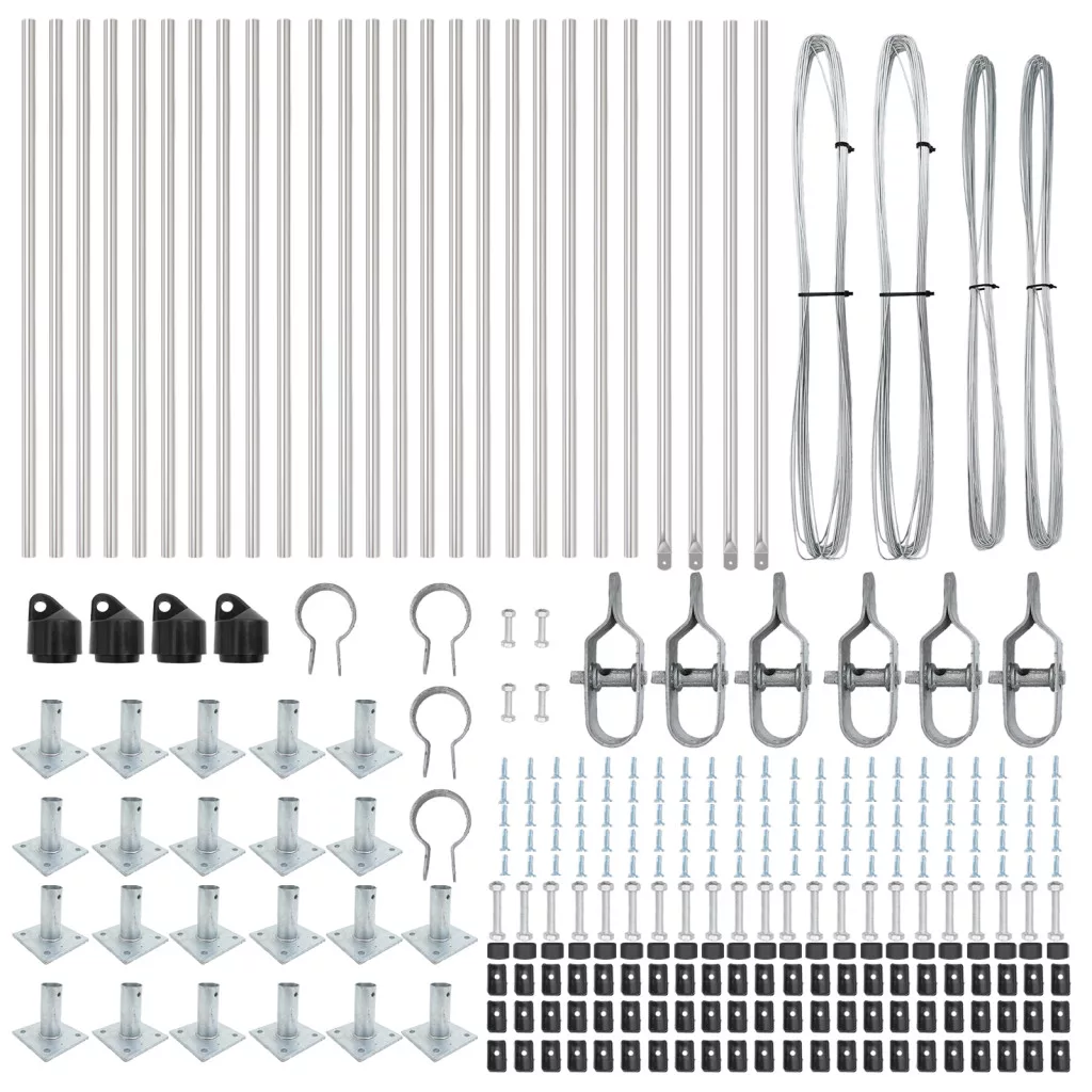 A szállítás tartalma: 22 x Oszlop, 4 x Sarokoszlop, 22 x Alaplap, 22 x Műanyag fedél, 66 x Műanyag feszítő drót támogató, 4 x Sarokoszlop fedél, 4 x Sarokoszlop hardver, 6 x Feszítő, 2 x 25 m Kötöző drót, 2 x 80 m Feszítő drót