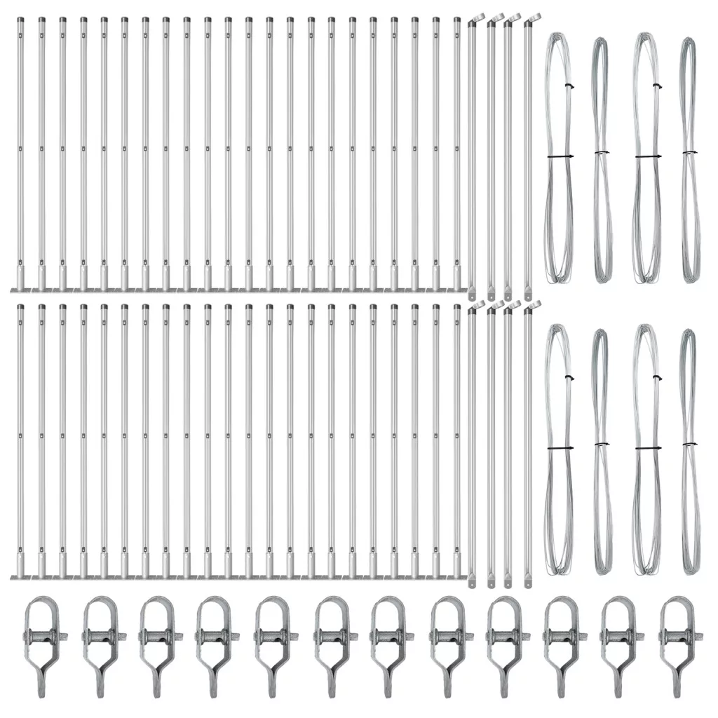 A csomag tartalma: 44 x oszlop, 8 x szögletes oszlop, 44 x alaplemez, 44 x műanyag kupak, 132 x műanyag feszítő drót támogató, 8 x szögletes oszlop kupak, 8 x szögletes oszlop alkatrészek, 12 x feszítő, 4 x 25 m kötéldarab, 4 x 80 m feszítő drót