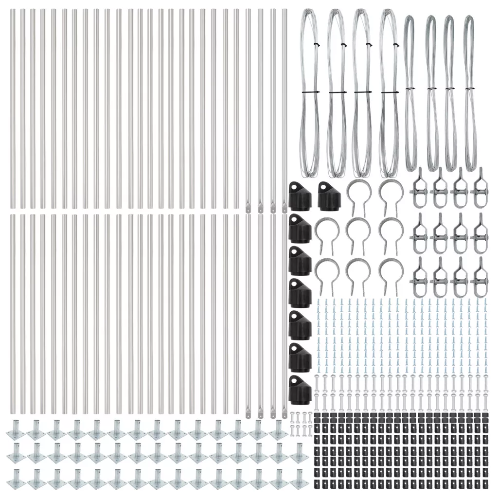 Szállítmány: 44 x Oszlop, 8 x Sarokoszlop, 44 x Alaplap, 44 x Műanyag fedél, 132 x Műanyag feszítődrót támogató, 8 x Sarokoszlop fedél, 8 x Sarokoszlop tartozék, 12 x Feszítők, 4 x 25 m Kötöző drót, 4 x 80 m Feszítő drót