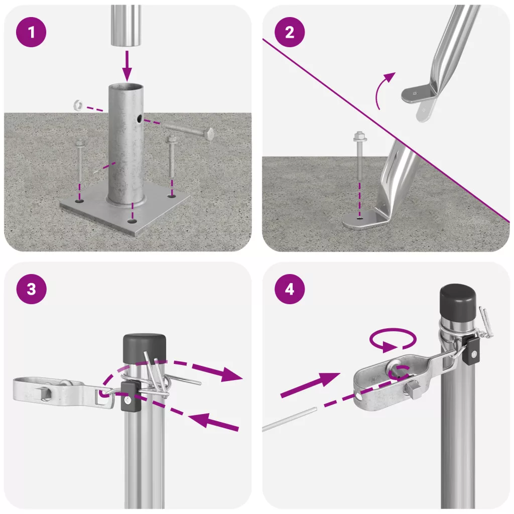 A szállítmány tartalma: 5 x oszlop, 2 x sarokoszlop, 5 x alaplap, 5 x műanyag sapka, 15 x műanyag feszítődrót támogató, 2 x sarokoszlop sapka, 2 x sarokoszlop hardver, 3 x feszítő, 1 x 25 m kötelelő drót, 1 x 33 m feszítődrót