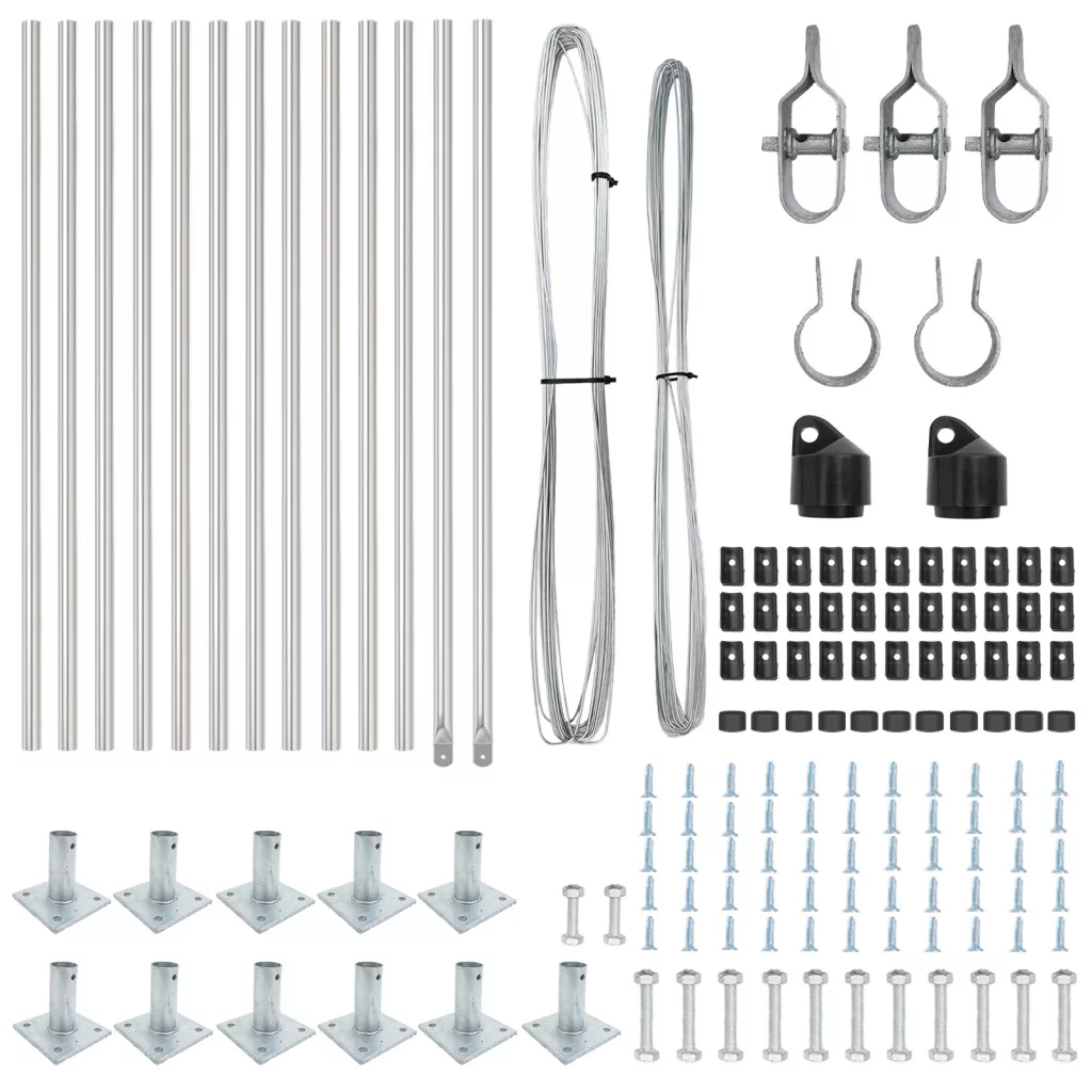 Szállítás tartalmazza: 11 x Oszlop, 2 x Szögletes oszlop, 11 x Alaplap, 11 x Műanyag sapka, 33 x Műanyag feszítő drótfogó, 2 x Szögletes oszlop sapka, 2 x Szögletes oszlop hardver, 3 x Feszítő, 1 x 25 m Kötöződrót, 1 x 80 m Feszítődrót