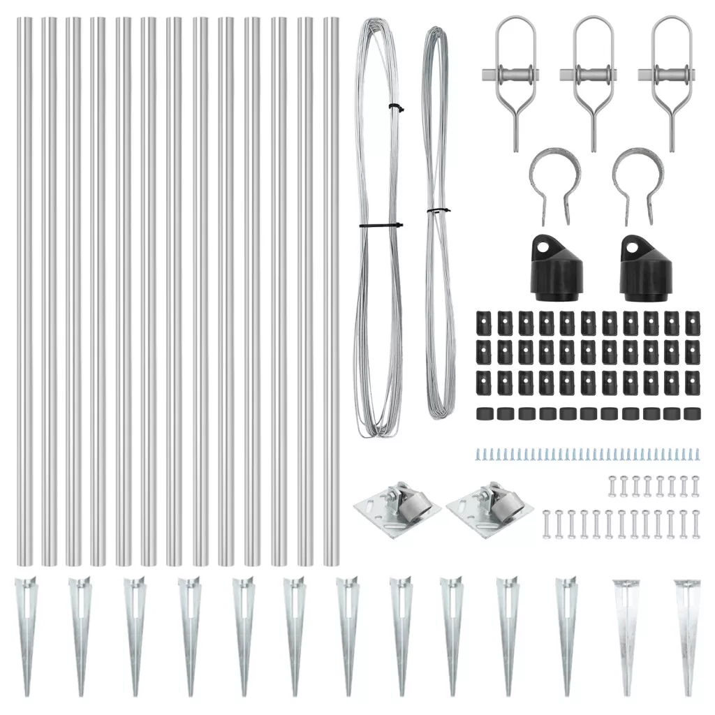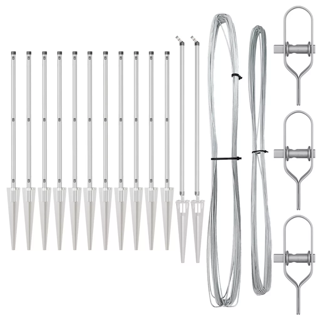 Kézbesítés tartalma: 11 x oszlop, 2 x sarokoszlop, 11 x spike, 2 x sarokspike, 11 x műanyag sapka, 33 x műanyag feszítődrót támogató, 33 x csavar a műanyag támogatóra, 2 x sarok oszlop sapka, 2 x sarok oszlop alkatrészek, 3 x feszítő, 1 x 25m kötéldrót, 1 x 80m feszítődrót