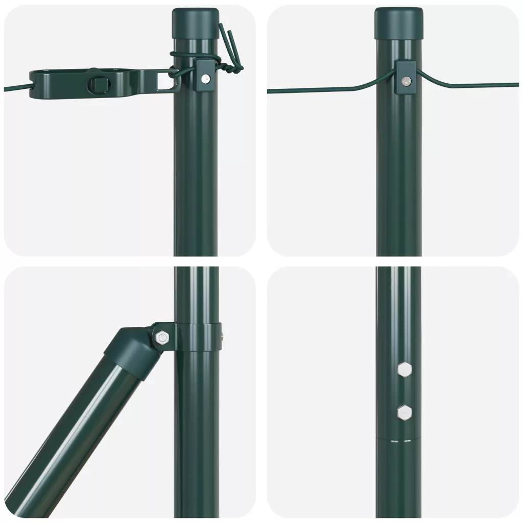 A csomag tartalma: 44 x oszlop, 8 x szögletes oszlop, 44 x alaplemez, 44 x műanyag sapka, 132 x műanyag feszítődrót-tartó, 8 x szögletes oszlop sapka, 8 x szögletes oszlop tartozék, 12 x feszítő, 4 x 25 m kötéldrótra, 4 x 80 m feszítődrótra