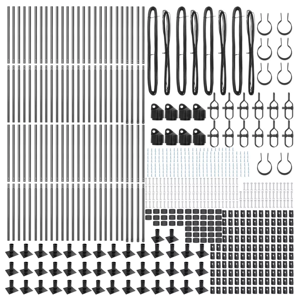A szállítás tartalmazza: 44 x Oszlop, 8 x Sarokoszlop, 44 x Alaplap, 44 x Műanyag kupak, 132 x Műanyag feszítődrót támogató, 8 x Sarokoszlop kupak, 8 x Sarokoszlop hardver, 12 x Feszítő, 4 x 25 m Kötelező drót, 4 x 80 m Feszítődrót
