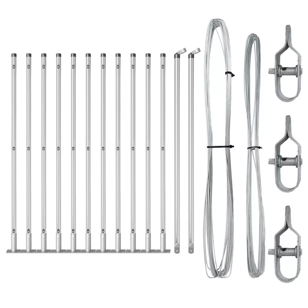 Kézbesítés tartalma: 11 x Oszlop, 2 x Sarokoszlop, 11 x Alaplemez, 11 x Műanyag sapka, 33 x Műanyag feszítődrót támaszték, 2 x Sarokoszlop sapka, 2 x Sarokoszlop hardver, 3 x Feszítő, 1 x 25 m Kötelező drót, 1 x 80 m Feszítő drót