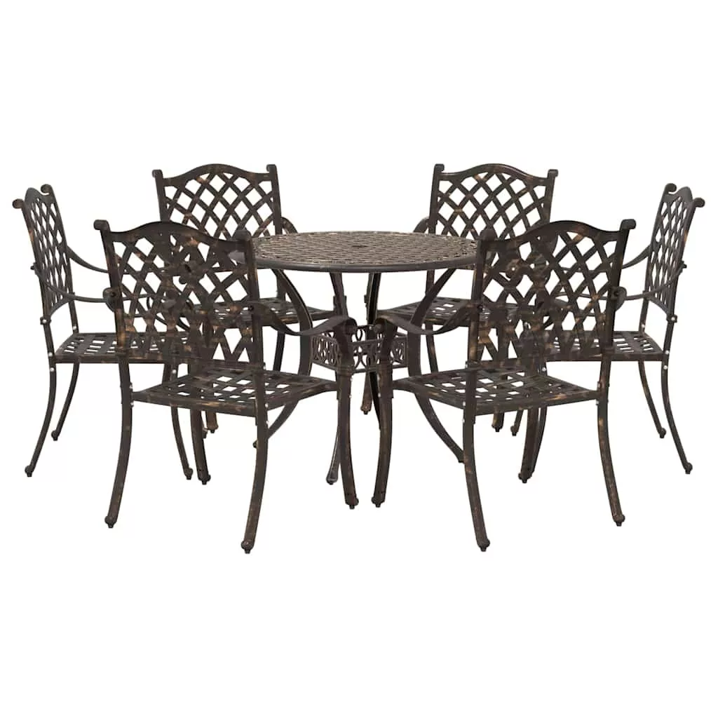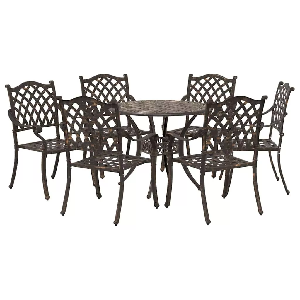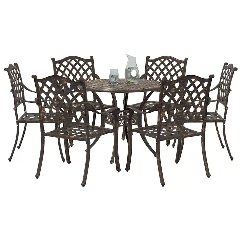 A Cast Aluminium kertibútor szett gyönyörű kiegészítője a kültéri kerteknek vagy teraszoknak. Klasszikus, hagyományos stílusa könnyen illeszkedik a különféle kültéri témákhoz, eleganciát és funkciót kínál minden alkalommal. Az alumínium megépítés nemcsak a kinézetét javítja, hanem a tartósságát is biztosítja. Kifejezetten a melegebb időben való használatra készült, és tökéletes választás laza vagy formális kültéri étkezésekhez is, ideális mindenkinek, aki kedveli a szabadtéri szórakozást. Teljes alumínium felépítés: Ez az étkező szett 100%-ban alumíniumból készült, amitől tartós és időjárásálló. Ezzel a szett sokáig megőrzi a kinézetét és jól bírja az elemeket. Hagyományos stílus: Elegáns dizájn és klasszikus részletek jellemzik, így ez a szett időtlen bájt kölcsönöz a kültéri helyeknek. Minden alkatrész úgy lett tervezve, hogy luxust és praktikusságot egyaránt nyújtson, tökéletes helyszínné téve a találkozókhoz. Alkalmas lapos karfák: Az alumínium karfák letisztult, egyszerű dizájnja kényelmet nyújt, miközben nem zavarja a szett esztétikáját. Praktikus összeszerelés: A szett összeszerelése könnyű, csupán két ember és egy csavarhúzó szükséges, így gyorsan elkészülhet a kerted vagy teraszod vendégek fogadására. Karbantartási utasítások: A bútorok karbantartása egyszerű. Használj huzatot, ha nem használod, és rendszeresen töröld le nedves ruhával, hogy mindig szép és funkcionális maradjon.