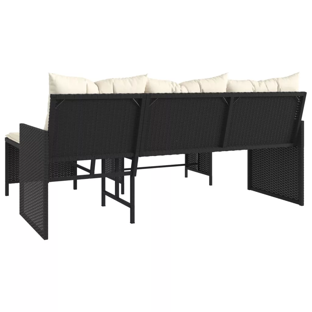 L-alakú fekete polyrattan kerti kanapé asztallal és párnával