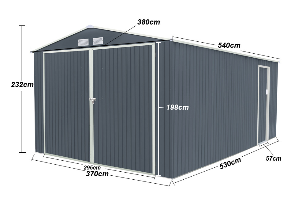 Külső teljes méret: 540 x 380cm x 232cmalapterület: 530 X 370 x 232cm (hossz x szélesség x magasság)