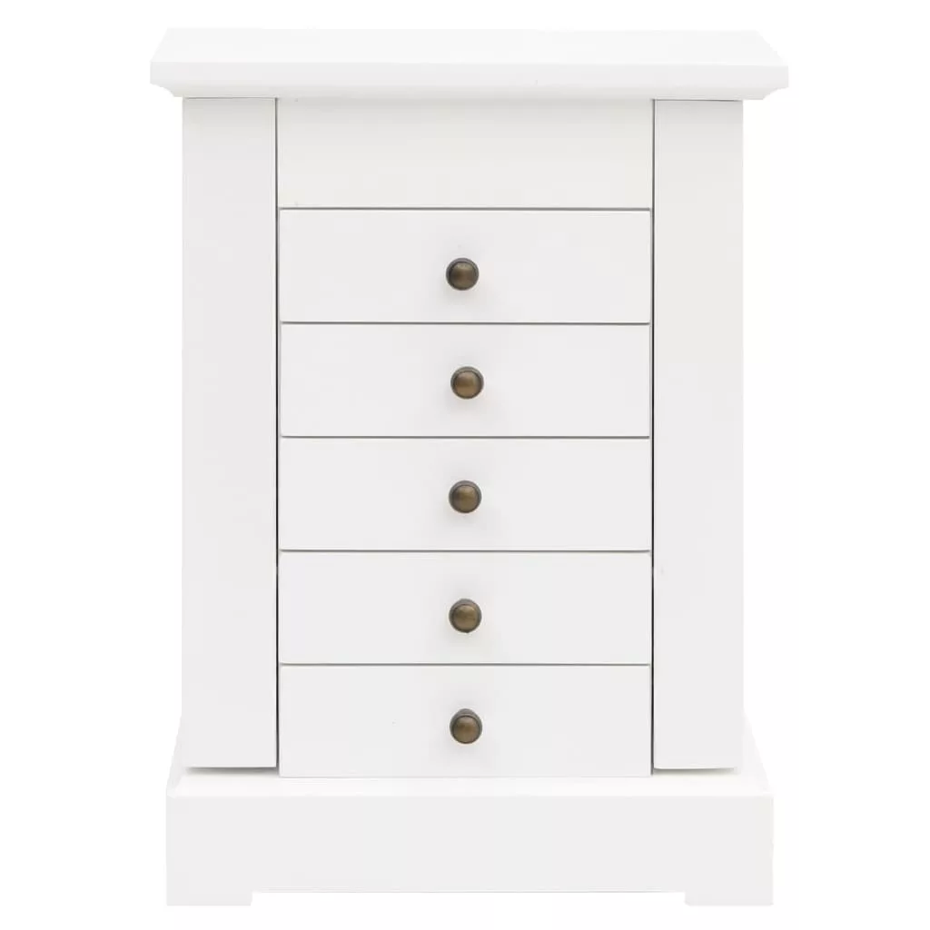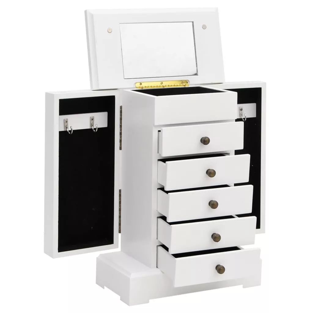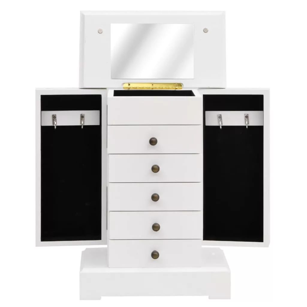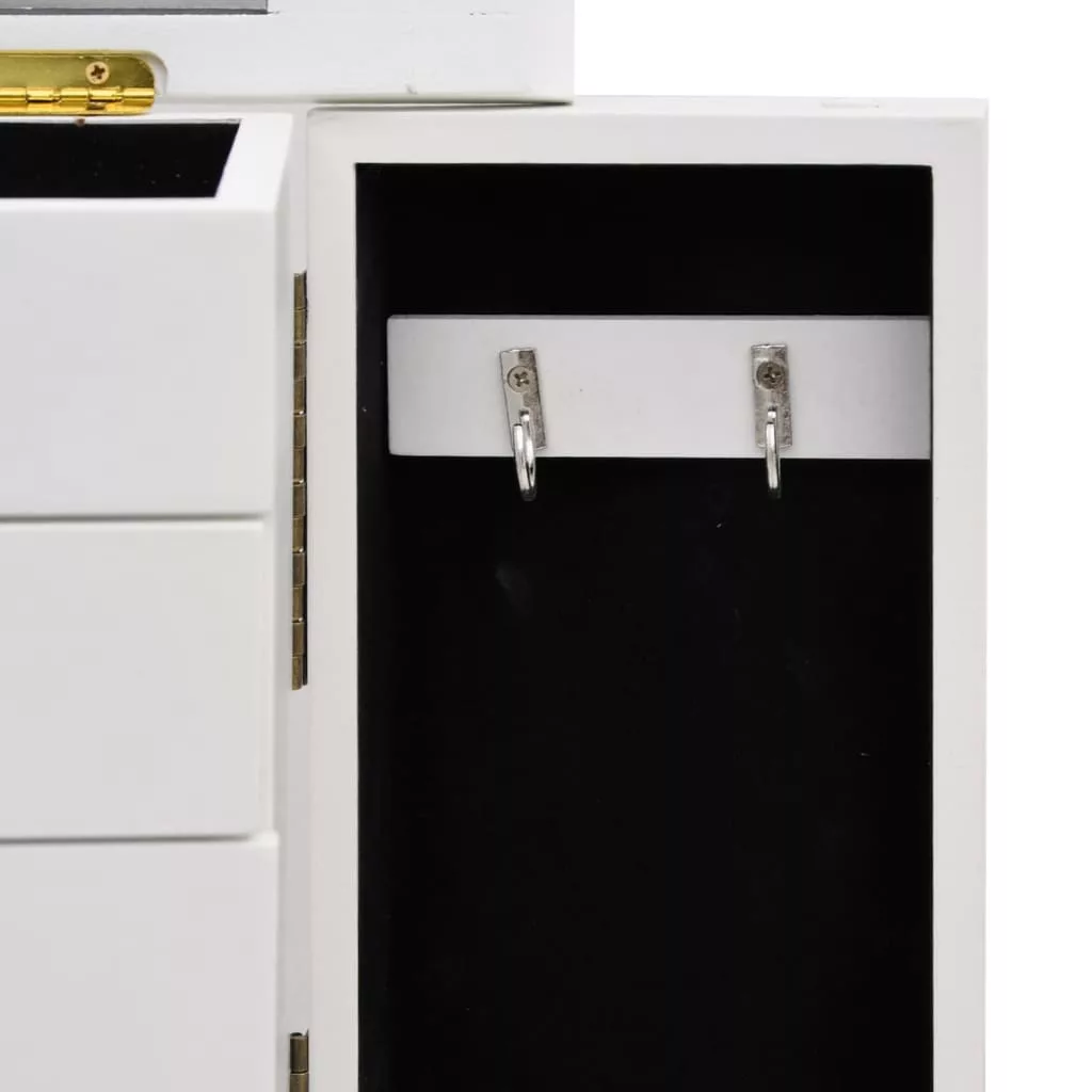 Ez az ékszertartó doboz nagyszerű kiegészítője lehet hálószobájának sikkes megjelenésének és letisztult fehér felületének köszönhetően. A dobozban rendezetten, elérhető közelségben tárolhatja ékszereit úgy, hogy azok nem porosodnak és nem fakulnak ki. A doboz MDF-ből készült, és tükörrel lett felszerelve. A panelt megemelve egy tükör és egy kisméretű ékszertartó áll a használó rendelkezésére. A tárolórekesz mindkét oldala nyitható, az itt található kampókra felakaszthatja nyakláncait, karkötőit és bokaláncait. 5 fiókkal rendelkezik, melyek bőséges helyet kínálnak a különböző sminkek, ékszerek és szépségápolási cikkek számára. Ha nem használja a tükröt, a tetejére kisebb kiegészítőket is tehet. A termék összeszerelt állapotban kerül kiszállításra; további szerelésre nincsen szükség.