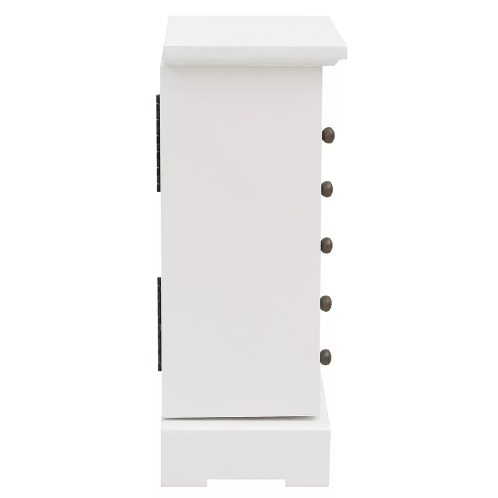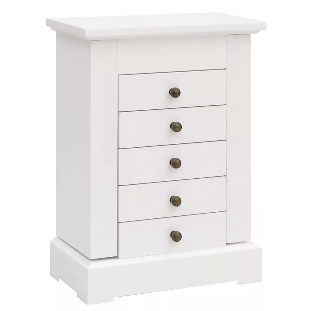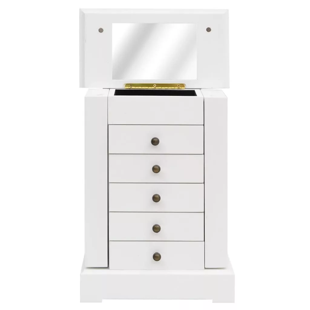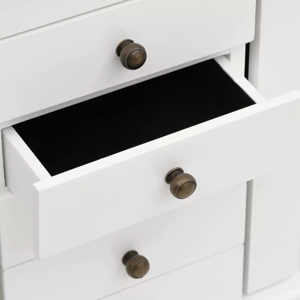 Ez az ékszertartó doboz nagyszerű kiegészítője lehet hálószobájának sikkes megjelenésének és letisztult fehér felületének köszönhetően. A dobozban rendezetten, elérhető közelségben tárolhatja ékszereit úgy, hogy azok nem porosodnak és nem fakulnak ki. A doboz MDF-ből készült, és tükörrel lett felszerelve. A panelt megemelve egy tükör és egy kisméretű ékszertartó áll a használó rendelkezésére. A tárolórekesz mindkét oldala nyitható, az itt található kampókra felakaszthatja nyakláncait, karkötőit és bokaláncait. 5 fiókkal rendelkezik, melyek bőséges helyet kínálnak a különböző sminkek, ékszerek és szépségápolási cikkek számára. Ha nem használja a tükröt, a tetejére kisebb kiegészítőket is tehet. A termék összeszerelt állapotban kerül kiszállításra; további szerelésre nincsen szükség.