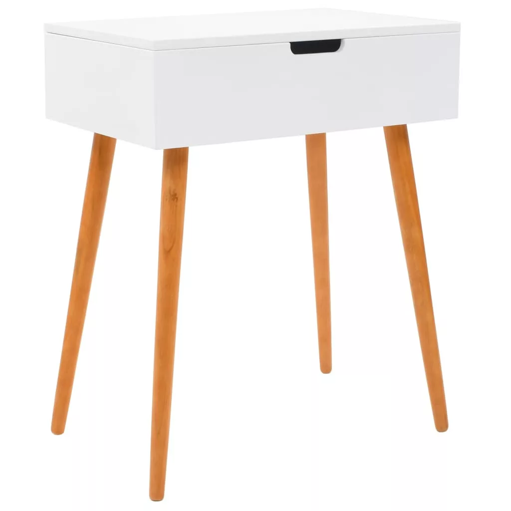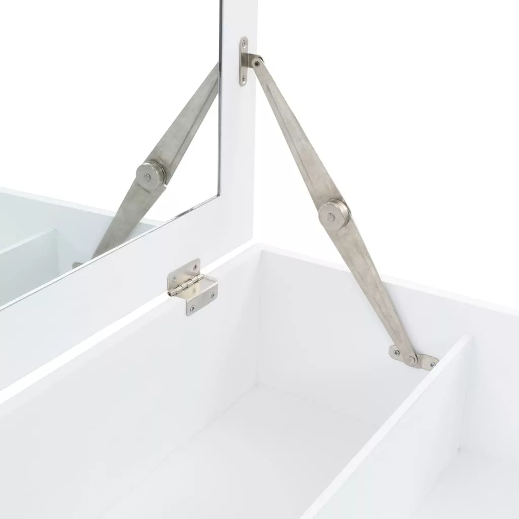 Ez az öltözőasztal nagyszerű kiegészítője lehet hálószobájának vagy öltözőjének sikkes dizájnjának és letisztult fehér felületének köszönhetően. Az asztal MDF-ből készült, és egy tükörrel lett ellátva. A panelt megemelve egy tükör és méretes ékszertartók állnak a használó rendelkezésére. Bőséges helyet kínál kozmetikumok, illetve haj- és bőrápoló termékek tárolásához. Ha nem használja épp a tükröt, az asztallap ideális helyet biztosít a különböző sminkek, ékszerek és szépségápolási cikkek számára. A masszív falábak hozzájárulnak az asztal stabilitásához, illetve az '50-es, 60-as éveket idéző dizájnjához. Könnyen összeszerelhető.