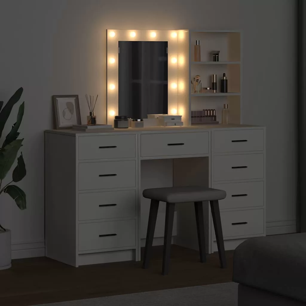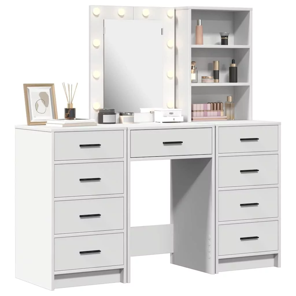 Ez a stílusos Modern Sminkasztal a letisztult vonalak és a szilárd funkcionalitás jegyében készült, így nagyszerű választás modern hálószobákhoz. Egyszerű téglalap formája és minimalista dizájnja könnyen illeszkedik bármilyen stílushoz, így remek kiegészítő bármelyik helyiségbe. Tökéletes a rendezett élethez, ez a darab egyensúlyt hoz a forma és funkció között, lehetővé téve, hogy saját kis menedékedet alakítsd ki a térben. Mérnöki Fából Készült Ezt a sminkasztalt magas minőségű mérnöki fából csinálták, szóval masszív és megbízható, garantálva a hosszú élettartamot. A sima felület remekül néz ki és ellenáll a mindennapi használatnak. Hatékony LED Világítás Rugalmas LED szalagokkal ez a sminkasztal éppen a megfelelő fényt biztosít, ötvözve a praktikusságot és a stílust. Ideális részletes sminkeléshez, amivel a sminkasztal még jobban használható. Praktikus Tárolási Megoldások Polcokkal és egy fiókkal bőséges hely áll rendelkezésre a kozmetikumok és szükséges dolgok rendben tartására. Ez a dizájn tökéletes azoknak, akik tiszta hálószobát szeretnének. Modern Hálószobákhoz Igazítva Sugárzó vonalai és praktikus jellemzői miatt jól passzol a kortárs terekhez. Legyen az az ágyad mellett vagy egy gardróbban, remekül harmonizál a meglévő bútorokkal. Karbantartás és Összeszerelés Az asztal három részben érkezik, és két ember kell az összeszereléshez. Hogy hosszú távon is megőrizzük állapotát, csak töröld le rendszeresen egy száraz ronggyal. Kérjük, vegye figyelembe, hogy csak tanúsított DC 5V bemenetet használjon. A magasabb feszültség túlmelegedést okozhat, és károsíthatja a készüléket, valamint túlhevülés és tűz kockázatát jelentheti. Ne csatlakoztassa ezt a terméket semmilyen más tápegységhez, mint amit a kézikönyvben, a névtáblán vagy a vidaXL kifejezetten ajánlott. Ezt a készüléket nem használhatják 14 évesnél fiatalabb gyermekek, valamint csökkent fizikai, érzékszervi vagy mentális képességekkel rendelkező személyek, vagy elektronikai eszközök használatában tapasztalatlan vagy tudás nélküli személyek. Az elektromosság veszélyes. A nem megfelelő telepítés, használat vagy módosítás (egyedi alkatrészek cseréje) a készülék károsodásához vezethet, áramütést és veszélyt okozva a felhasználónak. Ne működtesse ezt a terméket robbanásveszélyes atmoszférában, például gyúlékony folyadékok, gázok és por jelenlétében, vagy 50 Celsius foknál magasabb hőmérsékleten. Ne kapcsolja be a terméket, ha a csatlakozó kábel vagy tápegység láthatóan sérült. Ha a lámpa külső hajlékony kábele vagy vezetékje sérült, azt kizárólag a gyártó vagy annak szervizügynöke, illetve hasonló képesítéssel rendelkező személy cserélheti ki, hogy elkerülje a veszélyt. A telepítés és karbantartás alatt kapcsolja ki az áramot. Győződjön meg arról, hogy a fényforrások lehűltek. Ennek a lámpatestnek a fényforrása nem cserélhető; ha a fényforrás elérte élettartamának végét, az egész lámpát ki kell cserélni. Csak belső használatra, ne használja kültéren.