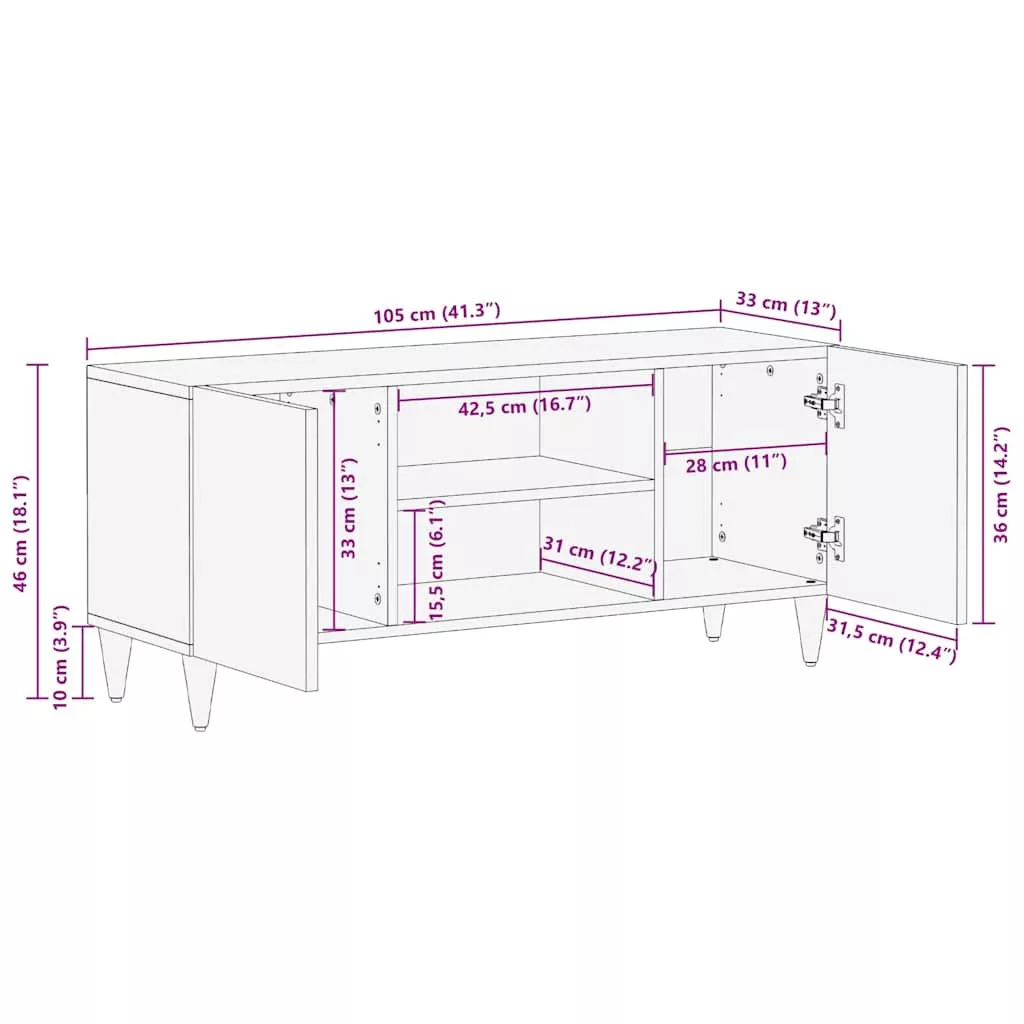 Ez a Tömörfa TV szekrény pont arra van szükséged, hogy praktikus és funkcionális módon tárold a médiáidat. Modern dizájnja és szép fekete-arany színkombinációja remekül passzol a mai lakásokhoz. Tökéletes választás a nappalidba, hiszen stílust és praktikus tárolást kínál a technológiádnak és a kiegészítőidnek. Anyagok: Magas minőségű tömör mangófából készült, így a TV szekrény gyönyörű természetes megjelenést ad a különleges erezetével és tartós felépítésével. Szerelt fa részek segítik a szilárd keretet, ami sokáig megőrzi frissességét akár zsúfolt otthonokban is. Hozzáadott elemek: A szekrény precízen kivitelezett polcokkal és ajtókkal bír, amik tömör mangófából készültek. A sima fekete fogantyúk extra stílust adnak és könnyen elérhetővé teszik a tartalmat. A szerelt fa lábak stabilan tartják a szekrényt. Funkciók / Használat / Dizájn: Rengeteg helyet kínál könyvek, elektronikai cikkek vagy dekorációs elemek tárolásához. A fényes és matt felületek dinamikus látványt nyújtanak, ami jól illik a modern lakóterekhez. Ellenőrzött felhasználások: Ez a szekrény szuper beltéri használatra, diszkrét, de hatékony tárolást biztosít a nappalid számára. Praktikus mérete miatt kisebb lakásokhoz is illik, segít rendben tartani a dolgokat, és hoz egy kis stílust. Fenntartás és karbantartás: Ahhoz, hogy mindig jól nézzen ki, elég, ha száraz ruhával letörlöd. Kerüld el a vizet, erős vegyszereket vagy bármilyen súrolószert, hogy megőrízhesd a csillogását és a szép állapotát hosszú távon.