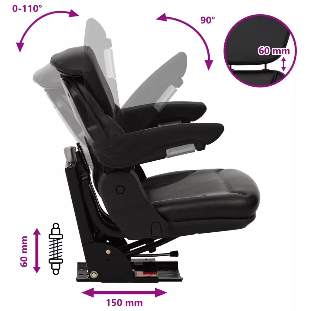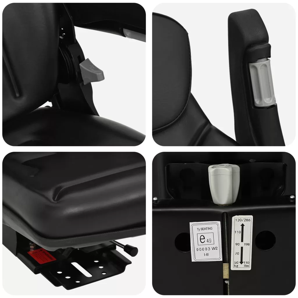 Ez a rugós ülés különböző gépekkel, mint például traktorokkal és targonca-vezérlőkkel kompatibilis. E-mark tanúsítványos biztonsági funkciókkal és több pozicionálási lehetőséggel rendelkezik, így könnyen használható 50-130 kg közötti súlyú vezetők számára. Tartós anyagok: Fém és PVC - az acél biztosítja a stabilitást, a PVC pedig jól bírja a különböző munkakörnyezeteket. Teljes testhelyzet-beállítás: Állítható fejtámla, kartámaszok és 0°-tól 110°-ig dönthető háttámla, amivel minden vezető megtalálhatja a neki legjobb pozíciót. Rugózás és rezgéscsökkentés: A 6 cm-es függőleges rugórendszer segít csökkenteni a rezgéseket, így kevésbé fáradsz el a vezetés közben. Biztonsági tanúsítvány: Az ülés E-mark tanúsítvánnyal rendelkezik, ami azt jelenti, hogy megfelel a járműbiztonsági normáknak. Rugalmas súlytartomány: Az ülés terhelhetősége 50 és 130 kg között van, így könnyen beállítható a felhasználói igényekhez.