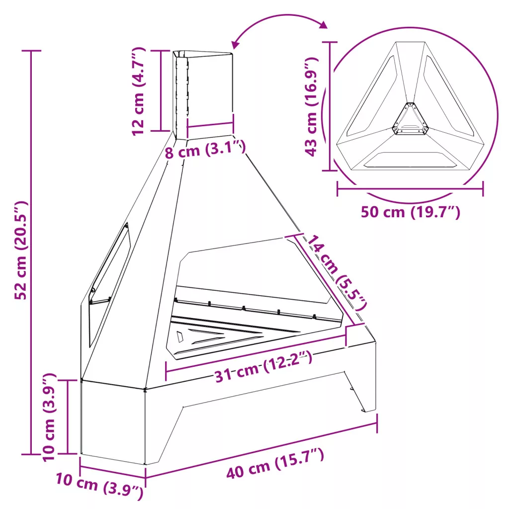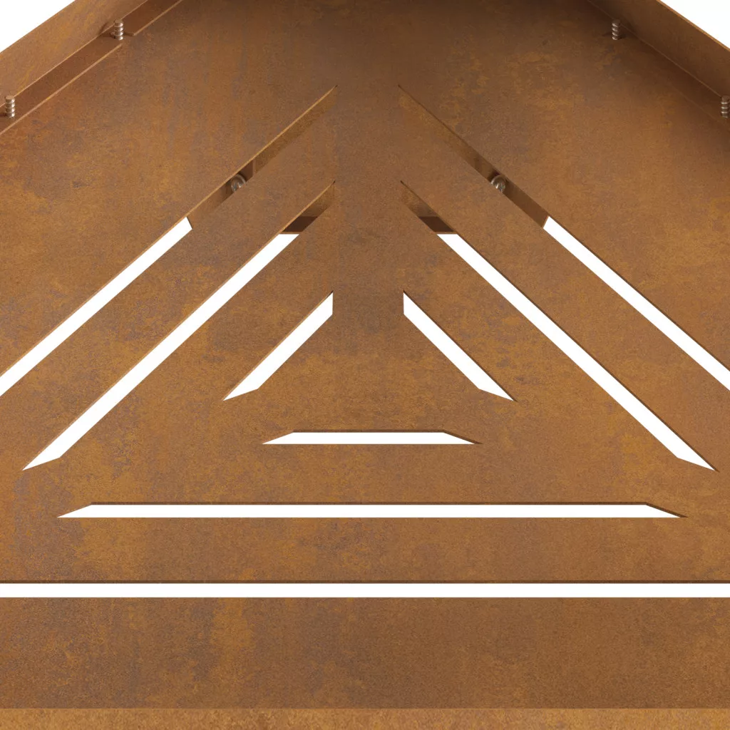 Ez a nagy rusztikus fatüzeléses kandalló melegséget és bájt hoz a kültéri helyedre, kényelmes teret teremtve a hűvös estékre. Strapabíró, időjárásálló acélból készült, nemcsak hőforrást biztosít, hanem feldobja a teraszt vagy a kert látványát is. A kandalló időjárásálló acélból készült, szóval bírja az elemeket, és évekig élvezheted. Rusztikus felülete gyönyörű viharvert hatást kelt, ami szuperül passzol a természethez. Háromszög alakja nemcsak praktikus, hanem szép középpont lett a kültéri összejövetelekhez. Fátüzelésre készült, természetes hangulatot teremt, amitől jól fogod érezni magad a ropogó hangok és jó illatok mellett. Rozsdamentes tulajdonságai biztosítják, hogy rendesen bírja a kültéri körülményeket, megbízhatóan működik egész évben. FIGYELEM: Ne használjon szeszt vagy benzint a be- vagy újragyújtáshoz!