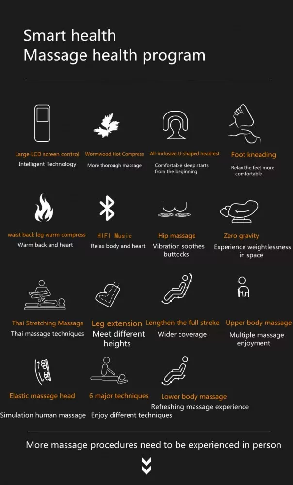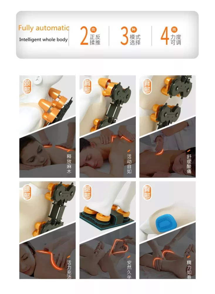 Massage areas: head, neck, waist/lumbar, hips, legs, back, soles of the feet