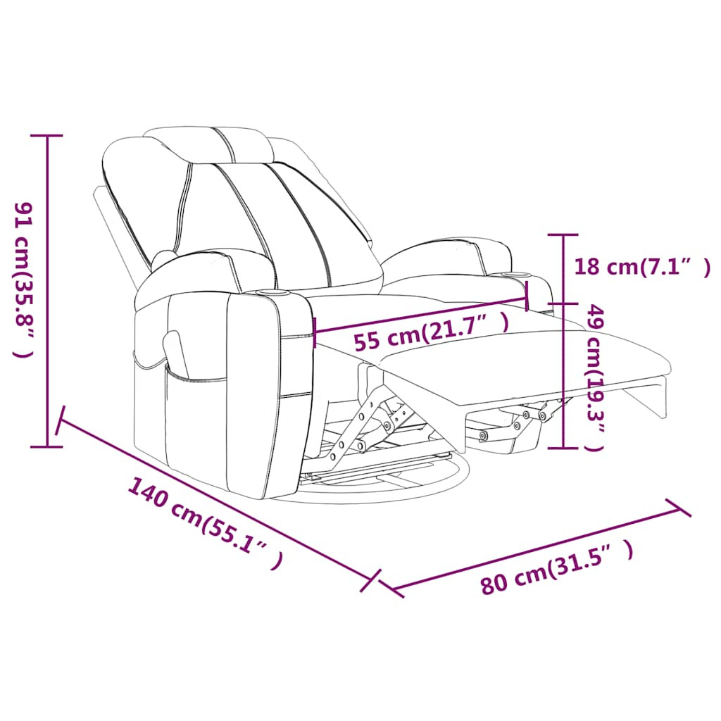 Ez az elektromos masszázshintaszék tökéletes választás a teljes ellazulásra egy mozgalmas munkanap végén. A prémium műbőrrel kárpitozott, vastagon párnázott ülőfelülettel és háttámlával ezt a forgatható fekvőtámlát úgy tervezték, hogy maximális kényelmet nyújtson. A TV-fotel forgatható rendszerrel rendelkezik, amely 360°-os kilátást biztosít. A masszírozó hintafotel 8 masszázsponttal rendelkezik, amelyek megnyugtatják az egész testet. A fűtési funkciónak köszönhetően a dönthető fotel kényelmes meleget bocsát ki, ami segít enyhíteni a feszültséget. A háttámla és a lábtámasz az Ön igényei szerint különböző szögekbe állítható. A hozzátartozó távirányító a masszázsfotel oldalzsebébe csúsztatható. Megjegyzés: A termék USB-csatlakozóval rendelkezik, ám a hitelesített 5 V-os USB áramforrást a csomag nem tartalmazza. Figyelmeztetés Csak otthoni használatra! Összeszereléséhez felnőtt szükséges. Csak felnőtt közvetlen felügyelete mellett használható! Csak háztartási használatra.