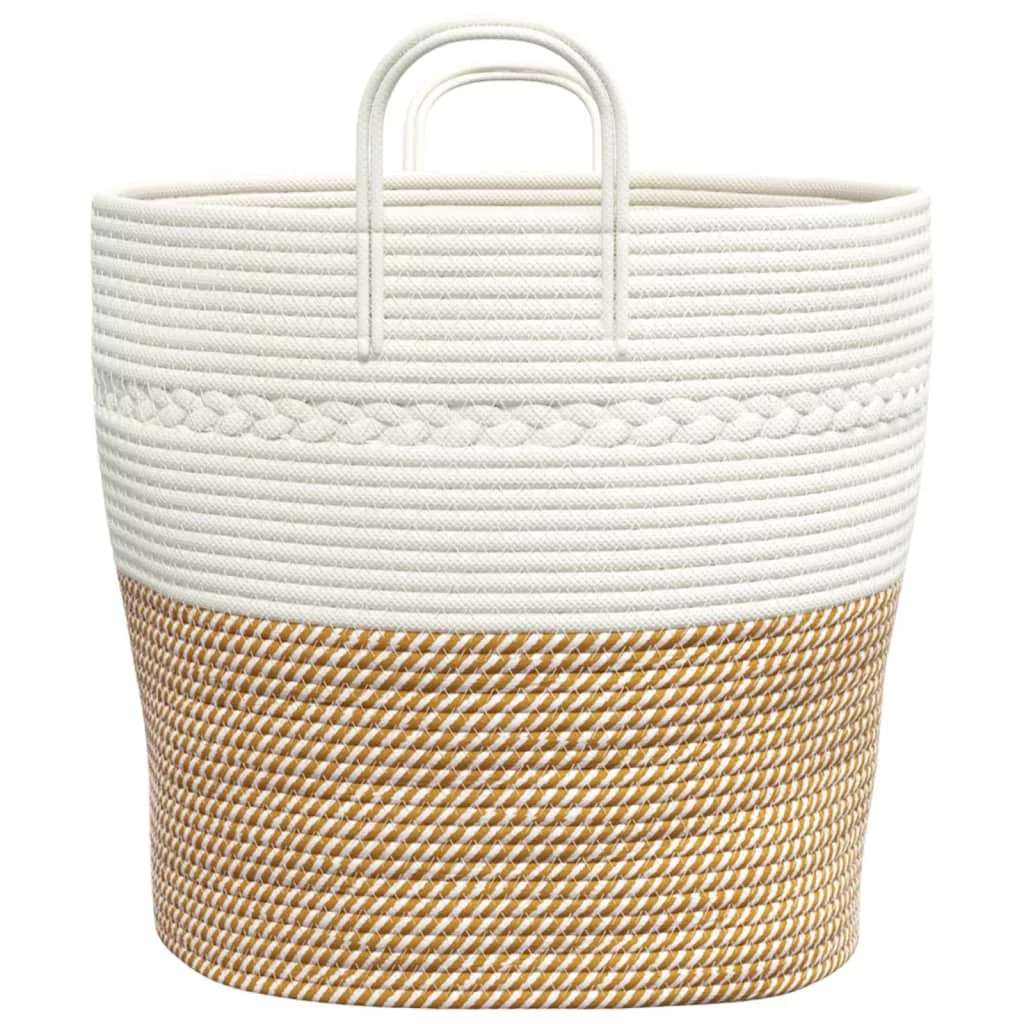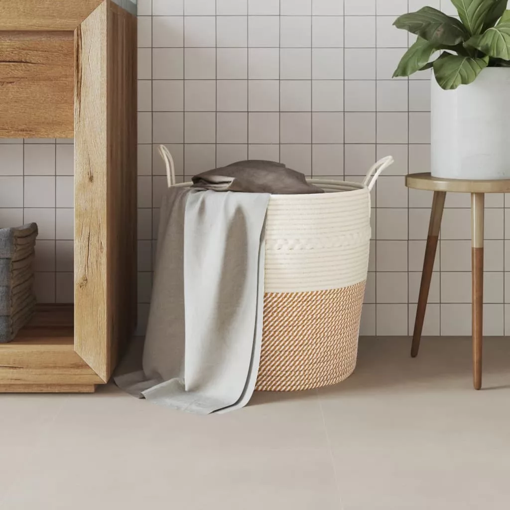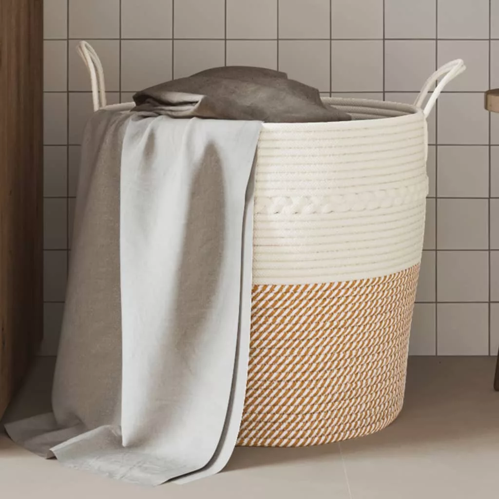 Ez a modern stílusú tárolókosár mindenkit lenyűgöz, és nem csupán praktikus, de igazán szemet gyönyörködtető is lesz bármely helyiségben. Tartós anyag: A kosár szőtt pamutkötelekből készült, amely egy légáteresztő, puha és kivételesen tartós anyag.Helytakarékos kialakítás: Az összecsukható kialakításnak köszönhetően használaton kívül könnyen tárolható, így az összecsukható tárolókosár ideális kis lakóterekbe.Egyszerű szállítás: A két erős fogantyúval ellátott takarótároló kosár kényelmes fogást és egyszerű szállítást biztosít.Sokoldalú kosarak: A dekoratív tárolókosár sokoldalú. Használható ruhák, törölközők, takarók, gyerekjátékok vagy egyéb otthoni holmik tárolására, elősegítve, hogy a környezet tiszta és rendezett maradjon. Jó tudni:Javasoljuk, hogy a kosár átvételekor tömje ki például párnákkal, hogy helyreálljon az alakja, vagy szükség esetén használjon vasalót a forma kialakításához.A kosár élettartamának meghosszabbítása érdekében kerülje a gépi mosást, mert alakját vesztheti. Ehelyett inkább óvatosan mossa ki kézzel a kosarat, ha szükséges.