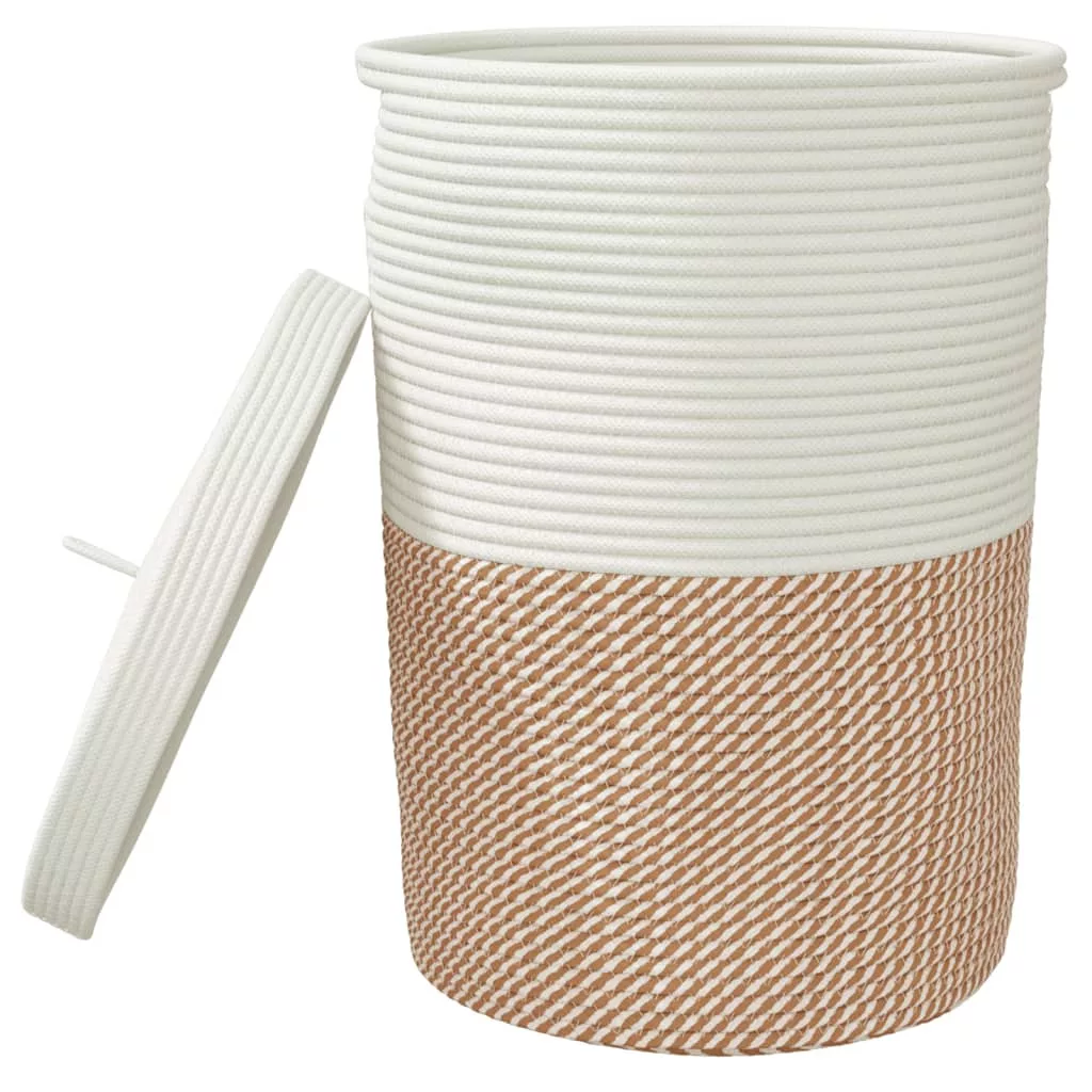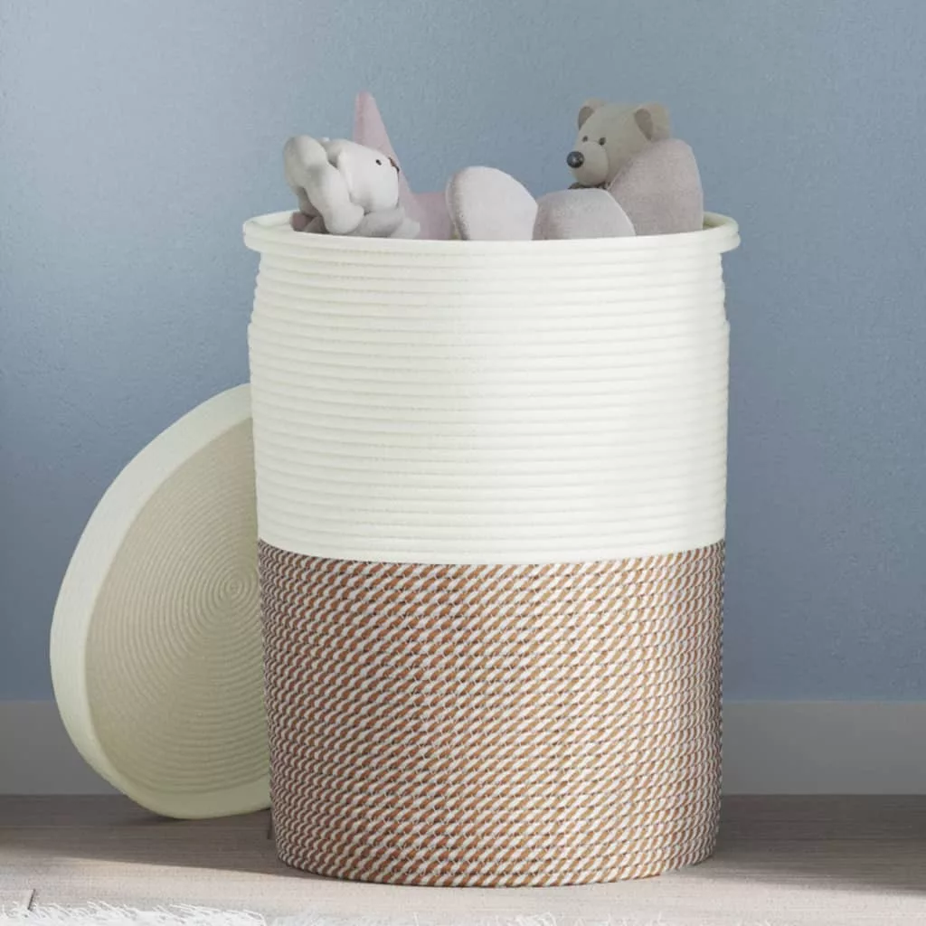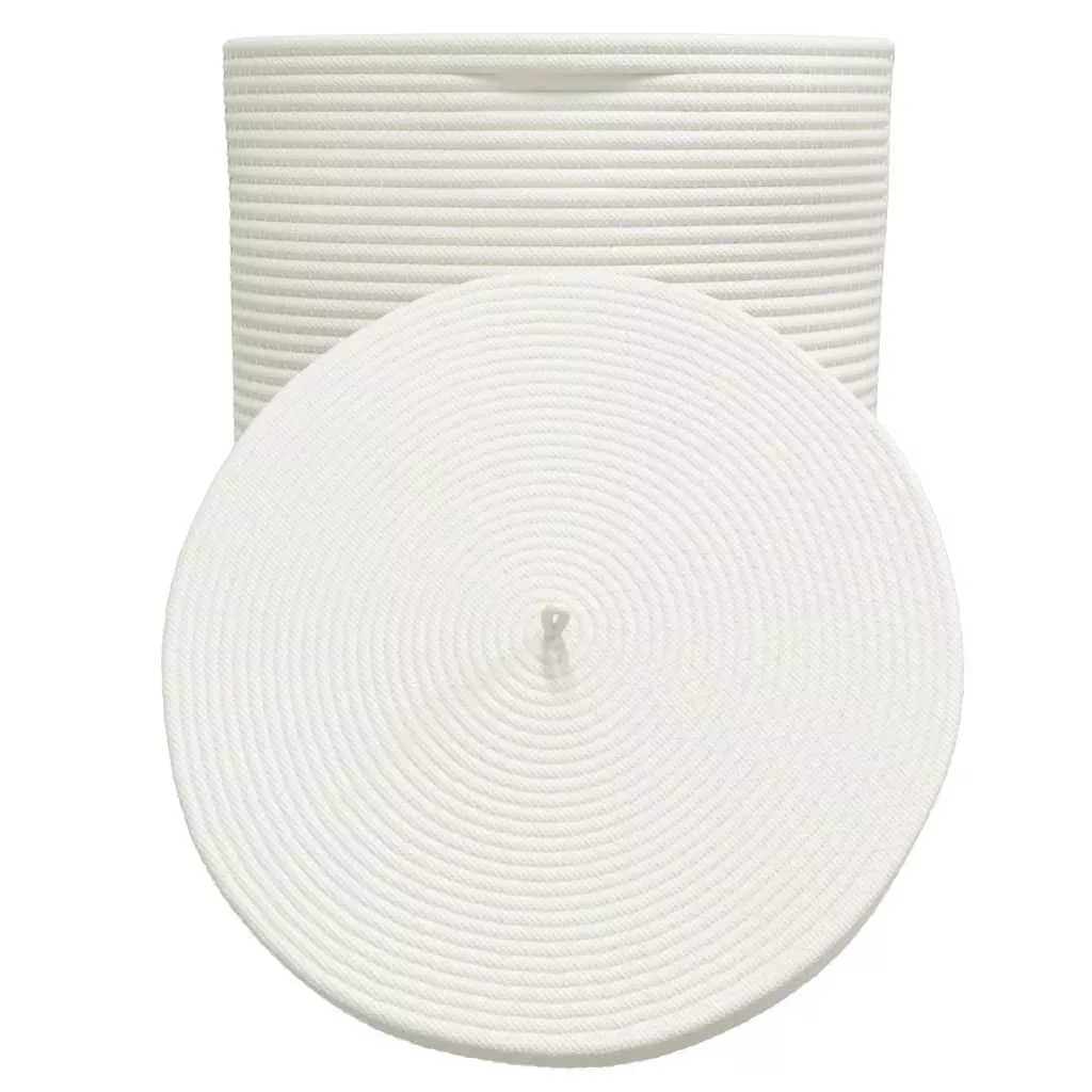 Ez a fedéllel ellátott modern stílusú tárolókosár mindenkit lenyűgöz, és nem csupán praktikus, de igazán szemet gyönyörködtető is lesz bármely helyiségben. Tartós anyag: A kosár szőtt pamutkötelekből készült, amely egy légáteresztő, puha és kivételesen tartós anyag.Helytakarékos kialakítás: Az összecsukható kialakításnak köszönhetően használaton kívül könnyen tárolható, így az összecsukható tárolókosár ideális kis lakóterekbe.Egyszerű szállítás: A két erős fogantyúval ellátott takarótároló kosár kényelmes fogást és egyszerű szállítást biztosít.Praktikus fedél: A szennyeskosár fedele megvédi a ruhaneműt a portól, és elfedi azokat a tekintetek elől.Sokoldalú kosarak: A dekoratív tárolókosár sokoldalú. Használható ruhák, törölközők, takarók, gyerekjátékok vagy egyéb otthoni holmik tárolására, elősegítve, hogy a környezet tiszta és rendezett maradjon. Jó tudni:Javasoljuk, hogy a kosár átvételekor tömje ki például párnákkal, hogy helyreálljon az alakja, vagy szükség esetén használjon vasalót a forma kialakításához.A kosár élettartamának meghosszabbítása érdekében kerülje a gépi mosást, mert alakját vesztheti. Ehelyett inkább óvatosan mossa ki kézzel a kosarat, ha szükséges.