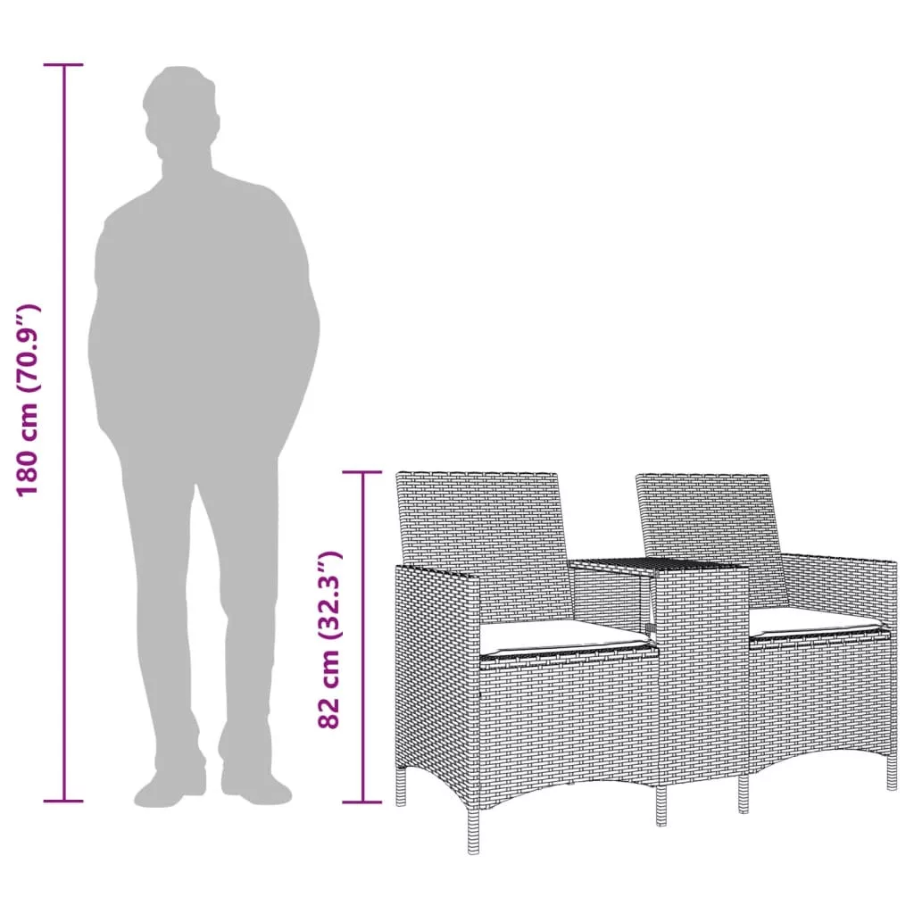 Pihenjen és élvezze a szabad levegőt ezen a kényelmes kerti kanapén! Tartós anyag: A PE rattan, más néven polyrattan, egy erős, kevés karbantartást igénylő szintetikus anyag, amely úgy néz ki, mint a természetes rattan. Könnyű, könnyen tisztítható, tartóssága és időjárásálló tulajdonságai miatt gyakran használják kültéri bútorok készítéséhez.Kényelmes központi asztal: Ez a kerti bútor egy beépített központi asztallal rendelkezik, amely kényelmes helyet biztosít a legfontosabb dolgok könnyen elérhető közelségben tartásához.Kényelmes ülőélmény: Ez a vastagon bélelt párnákkal kiegészített kültéri bútor kényelmes ülőélményt kínál.Levehető és mosható huzat: Ezek az ülőpárnák levehető huzattal rendelkeznek az egyszerű mosás és karbantartás érdekében.Robusztus és stabil váz: A porszórt acél váz biztosítja, hogy a kerti bútor erős és stabil legyen a mindennapi kültéri használathoz. Jó tudni:A kültéri bútor szépségének megőrzése érdekében javasoljuk, hogy vízálló huzattal fedje be. Maximum 110 kg ülésenként. Ügyeljen a nyílt tűz és más erős hőforrások veszélyére a termék közelében.