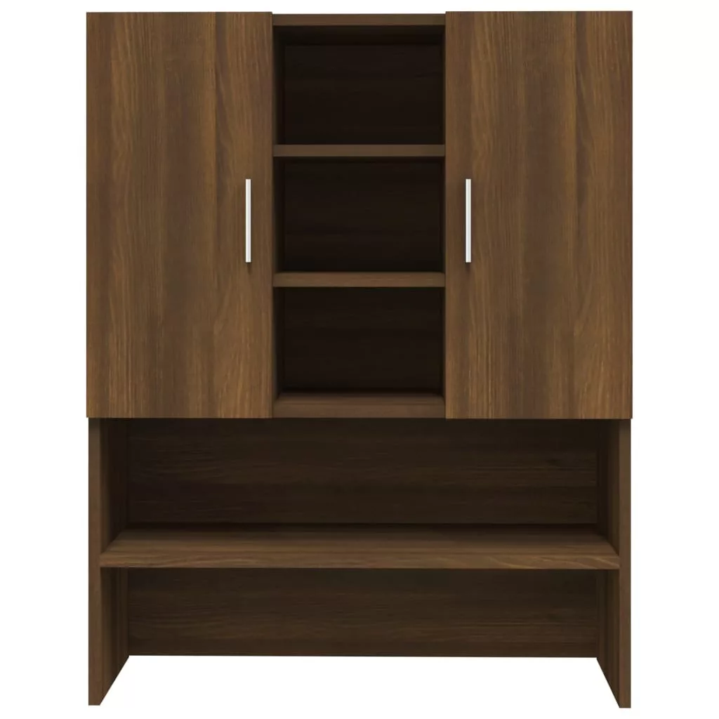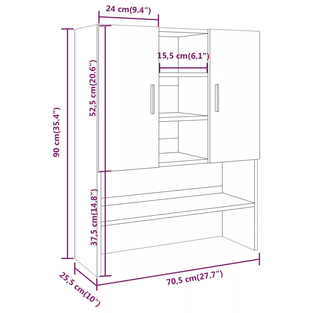 Ezzel a mosógépszekrénnyel további tárhelyet alakíthat ki és optimálisan használhatja azt fel a fürdőszobában vagy a mosókonyhában. Prémium minőségű anyag: A szerelt fa kivételes minőségű, sima felületű, szilárd, stabil, és ellenáll a nedvességnek.Bőséges tárolóhely: A 2 ajtó és a 9 rekesz bőséges tárolóhelyet kínál a mosóeszközök, tisztítószerek, piperecikkek és egyebek kézközelben történő rendezett tárolásához.Modern kialakítás: Varázsoljon modern stílust meglévő belső terébe! A modern kialakítás letisztult vonalakkal, minimalista megjelenéssel és természetes fénnyel járul hozzá a belsőépítészeti stílushoz. Figyelem:A dőlés megakadályozása érdekében a terméket a mellékelt tartóelem segítségével rögzíteni kell a falhoz. Megjegyzés:A szállítmány csak a felső szekrényt tartalmazza.Az egyszerű összeszerelés érdekében minden termékhez mellékelünk összeszerelési útmutatót.