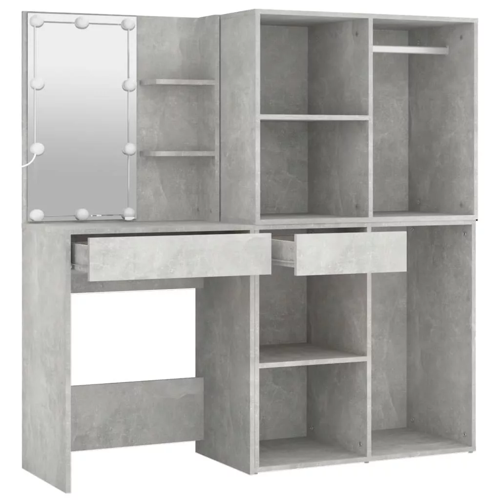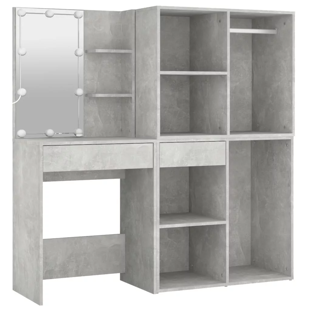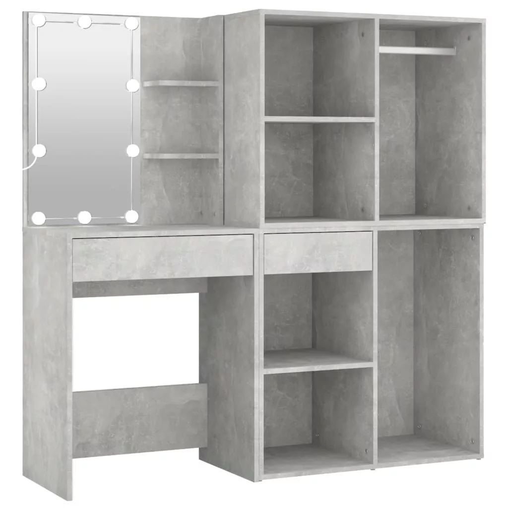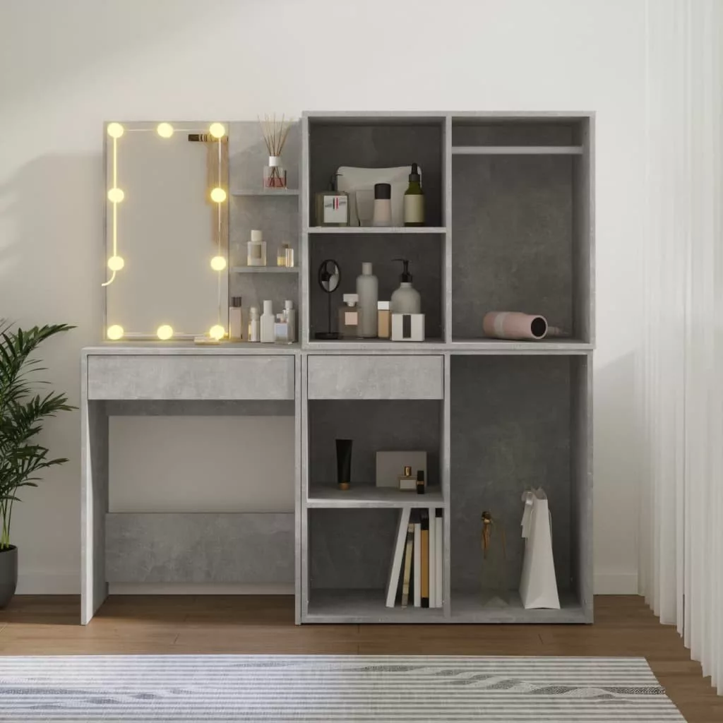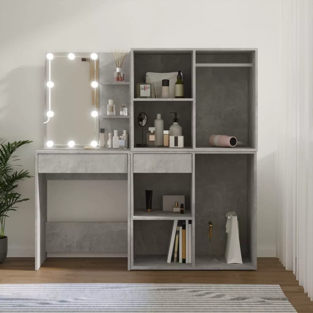 betonszürke szerelt fa LED-es fésülködőasztal 2 szekrénnyel
