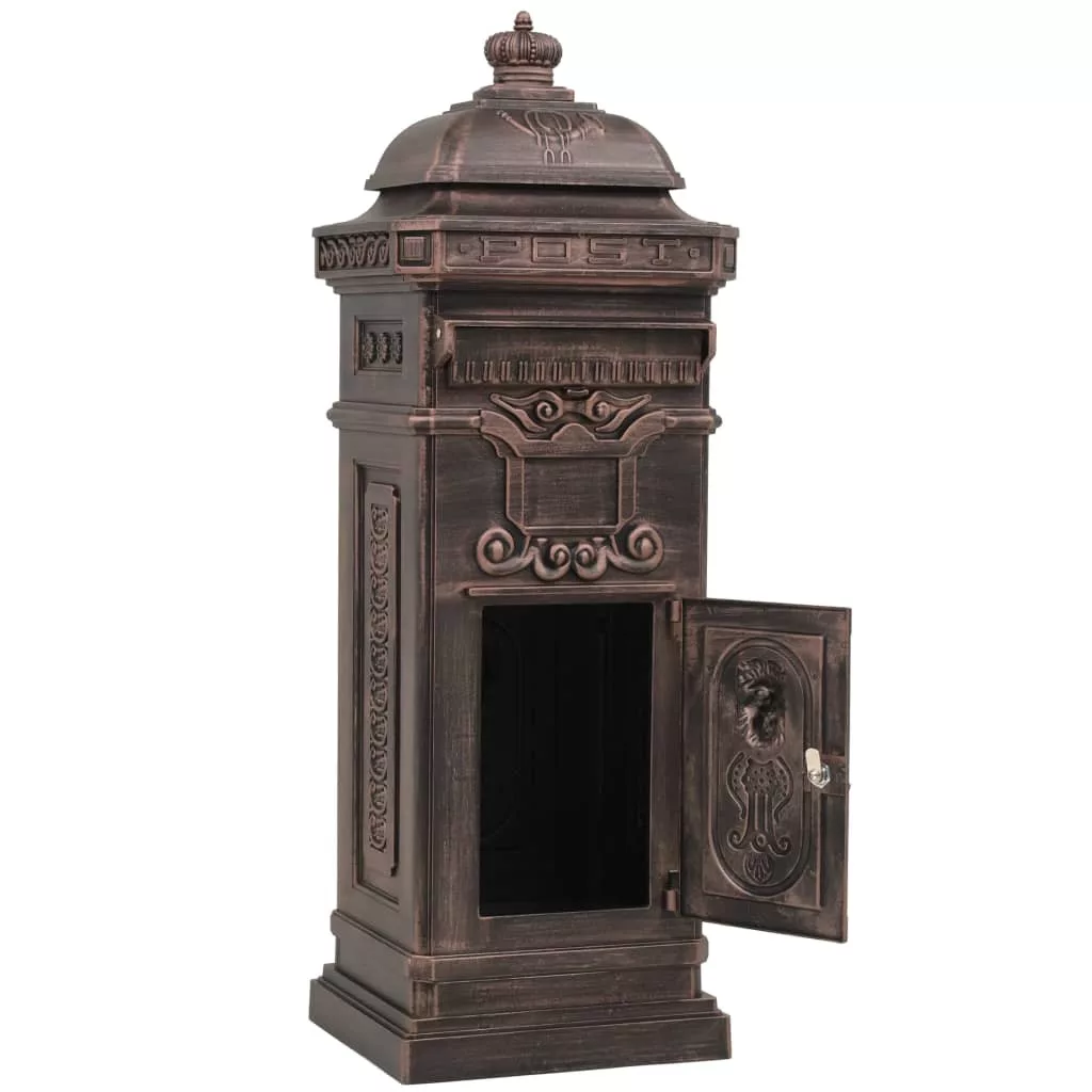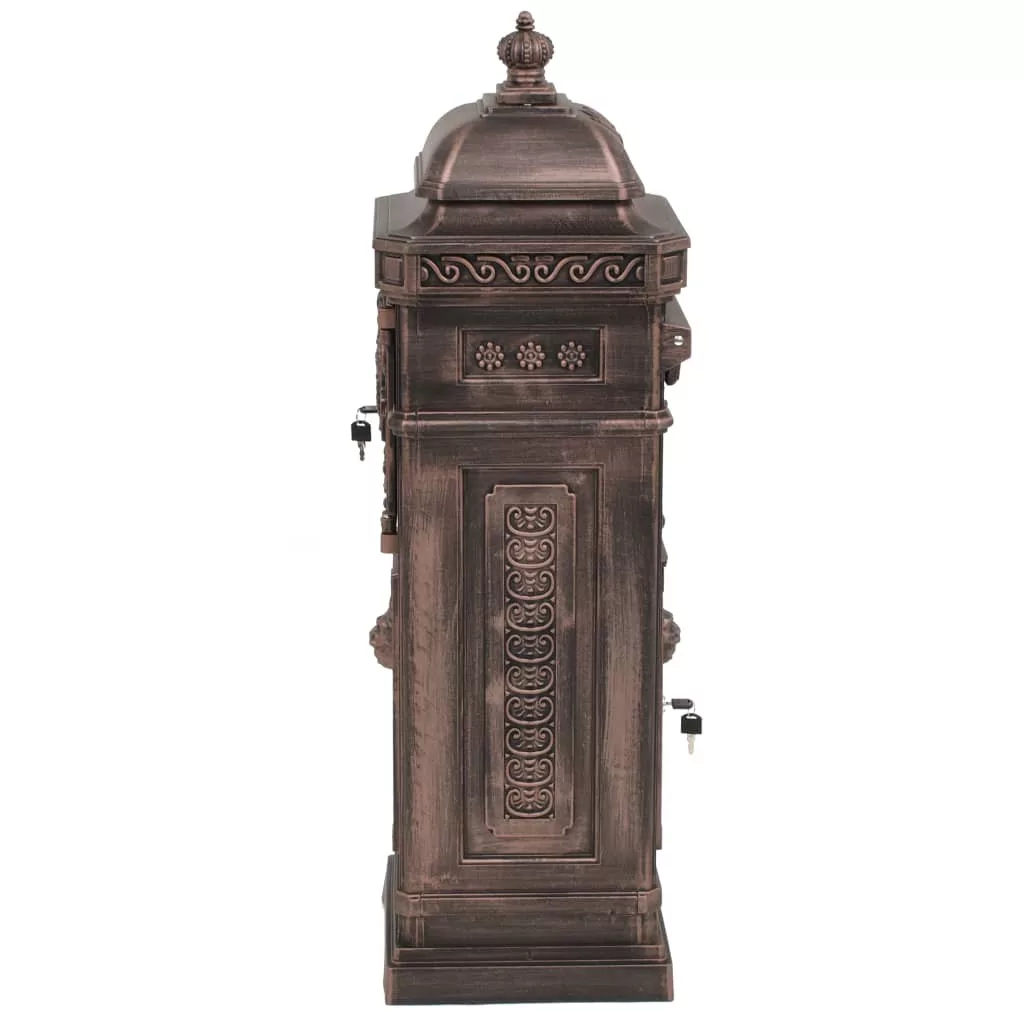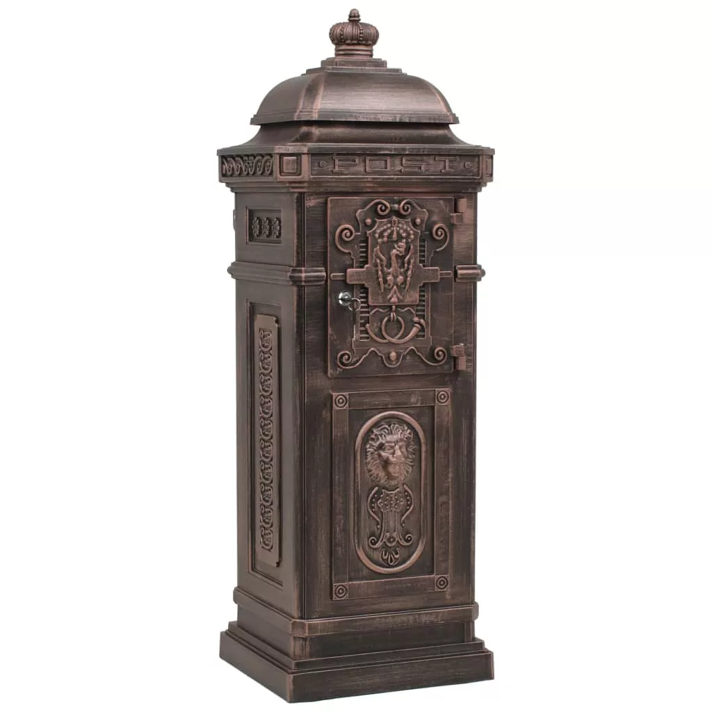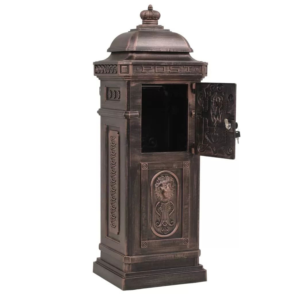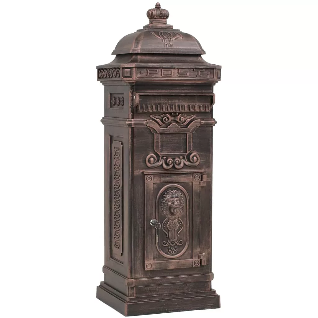 Ez a gyönyörű, antik stílusú álló postaláda nemcsak praktikus, de mutatós darab lesz kertjében, otthona bejáratánál, vagy cége székhelyén. A postaláda széles bedobónyílással rendelkezik, amelynek csapófedele a postaláda tartalmát megóvja az időjárás viszontagságaitól. Két zárható ajtaján (2 kulcs jár minden ajtóhoz) könnyen kivehetőek a levelek. A levélszekrény időjárásálló és rozsdamentes alumínium öntvényből készült, így különösen alkalmas kültéri használatra. Remekbe szabott régimódi díszítőelemek sokasága pompázik rajta – kocsibejárója vagy kerti járdája mellett mindenki figyelmét fel fogja kelteni.